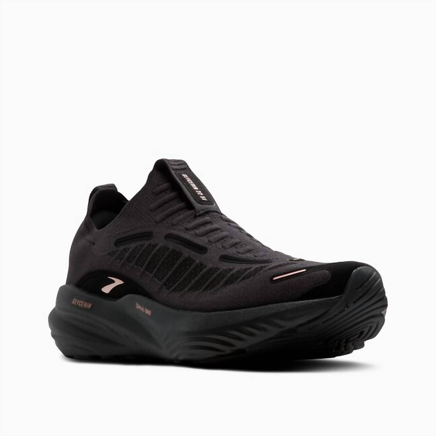 Experience unparalleled comfort with the Brooks Glycerin 22 SE Sneakers, designed in sleek Black Metallic Rose Gold. These women's athletic shoes feature a super-soft DNA Tuned midsole, crafted with innovative nitrogen-infused cushioning for plush landings and energizing toe-offs. The shoes boast 61.3% sustainability with their recycled material upper and are perfect for long road runs, offering smooth, stable transitions. The flat heel measures at 0.39 inches, and they have a midsole drop of 10mm, with an overall weight of just 10.2 oz. Ideal for fitness and athleisure activities.