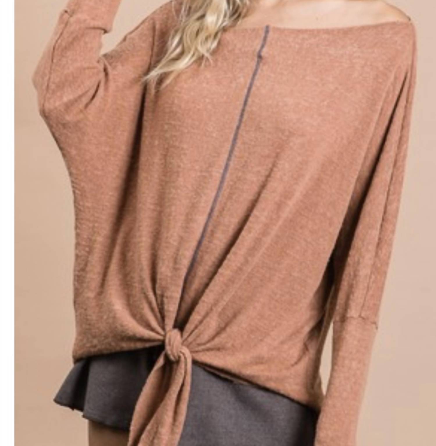 Showing just the right amount of skin, this off-the-shoulder sweater is a top choice for transitional seasons.A warm, rust-colored top with a laid-back knot detail at the front—perfect for effortless layering. The soft fabric and loose fit make it a go-to for cozy, casual days!
