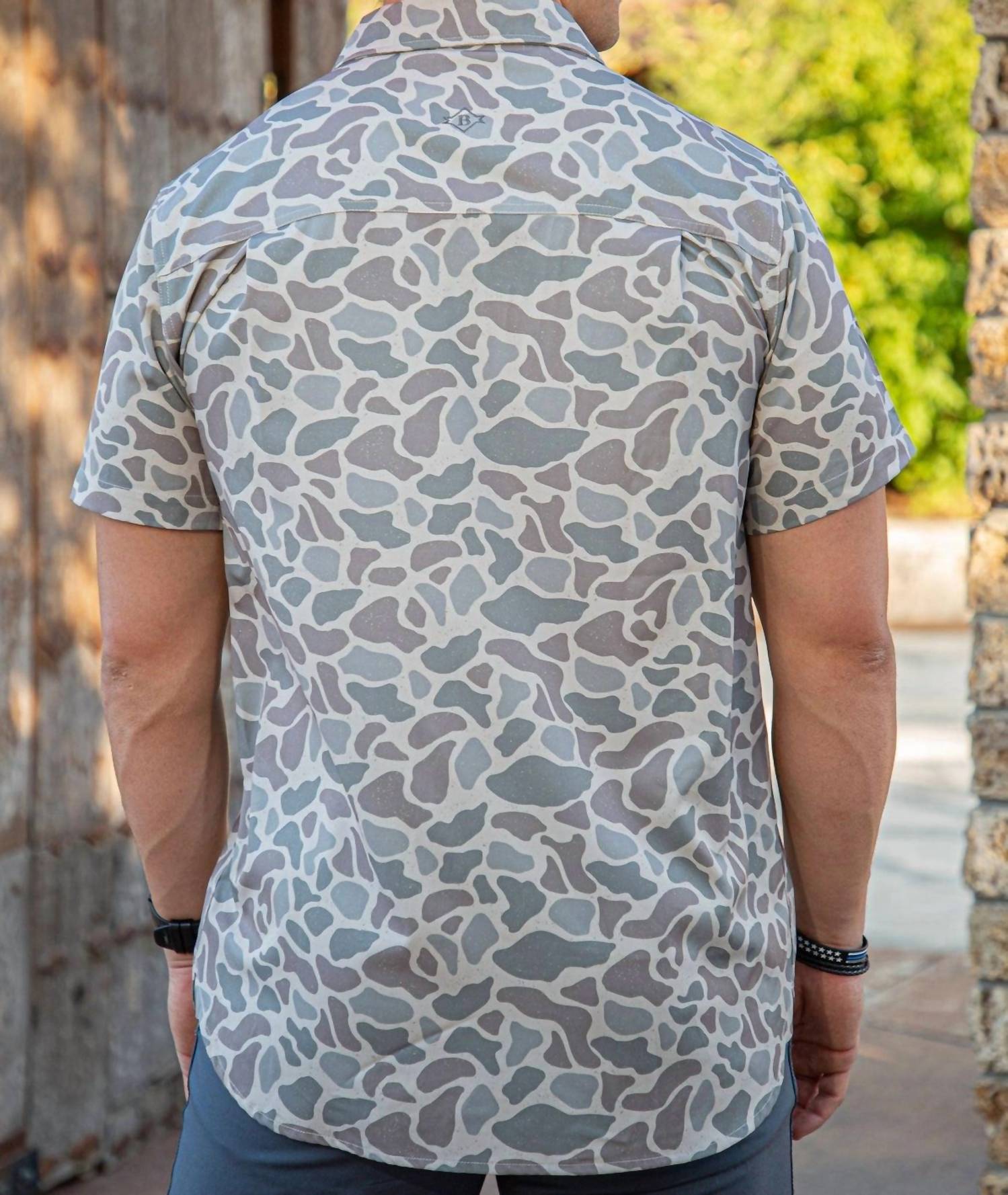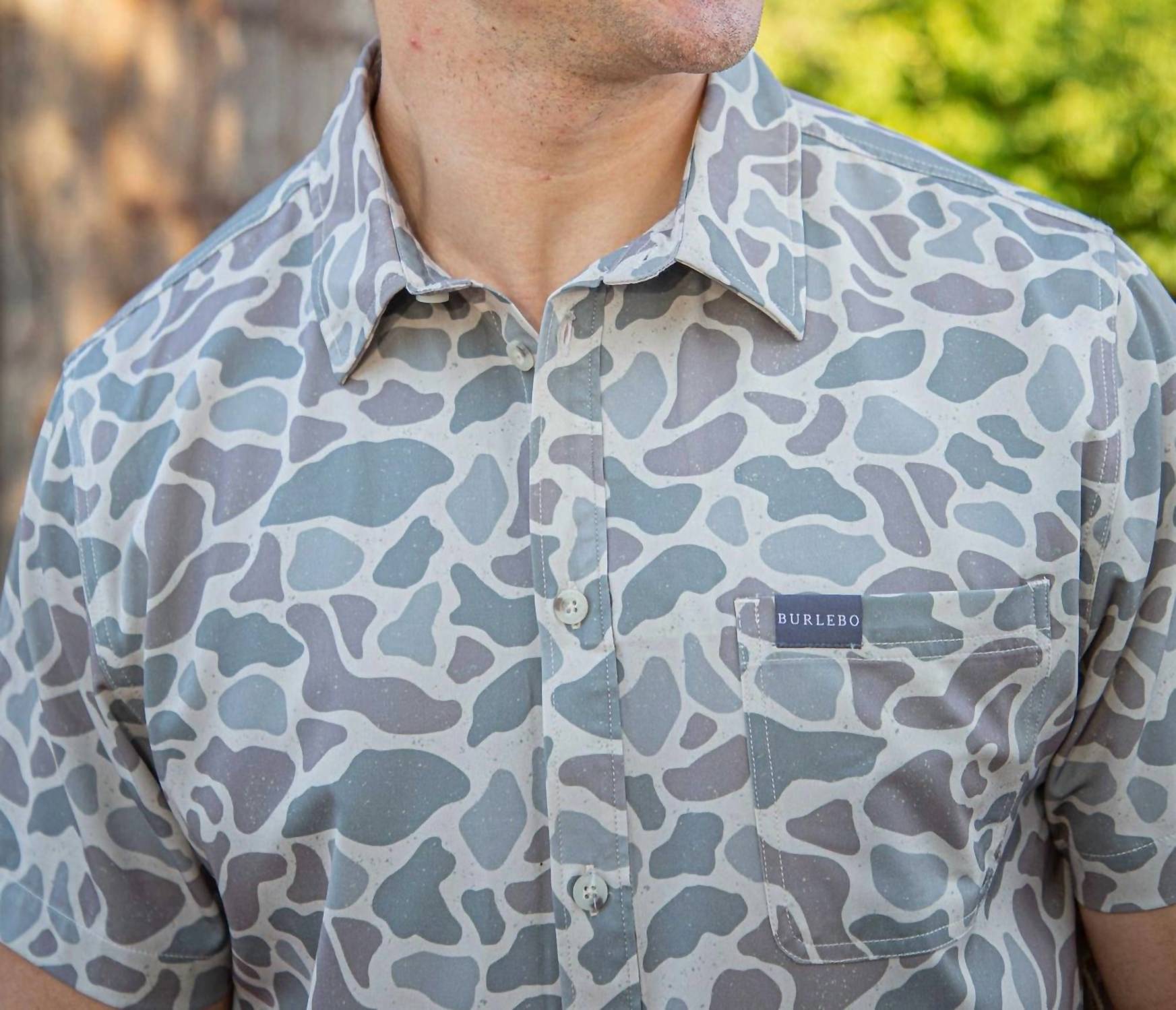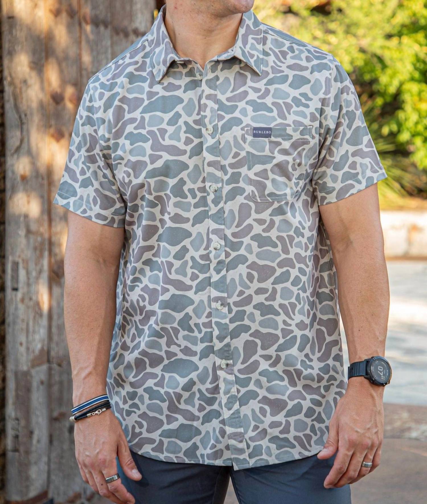 Introducing the Performance Button Up Shirt by BURLEBO, a camo-print essential for the active man. Featuring a short sleeve design made from 90% Polyester and 10% Spandex, this shirt boasts lightweight performance fabric that offers breathable, quick-dry, and moisture-wicking four-way stretch capabilities. Closure: Button closure. Care: Machine wash, tumble dry. The shirt is designed with practicality in mind, including a chest pocket for added convenience. Perfect for summer vacations, it's tailored for those who appreciate a minimalist style and are ready to embrace a casual yet stylish look. Trey is wearing a size large (6’1”, 210 lbs).