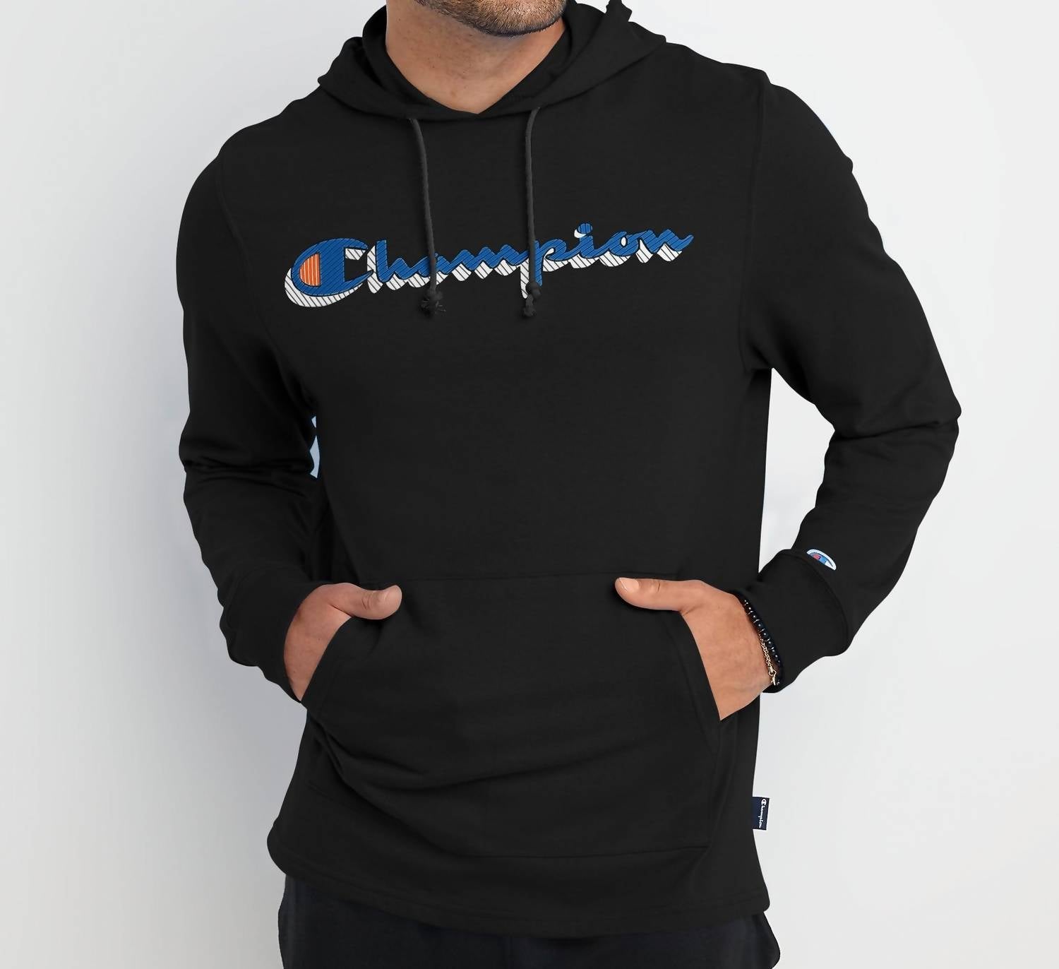 ALL-SEASON T-SHIRT WEIGHT HOODIE No need to give up your favorite hoodie when the temps rise. This t-shirt weight hoodie is ideal for warmer days and features a standard men's fit for on point style. Made with traceable U.S. grown cotton for year-round comfort. Knit hoodie has front pouch for hand warmth. Champion script across chest and iconic 'C' patch on left wrist.