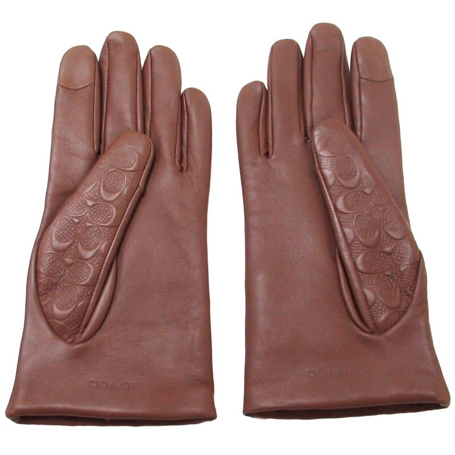 Introducing the Women's Signature Leather Embossed Tech Gloves by Coach, a luxurious accessory in Dark Saddle perfect for tech-savvy individuals. These pull-on style gloves feature a 100% sheep leather exterior, complete with a logo embossing for a touch of elegance. The lining is crafted from 100% wool, providing warmth and comfort. With integrated tech glove technology, these gloves allow you to effortlessly interact with your devices.