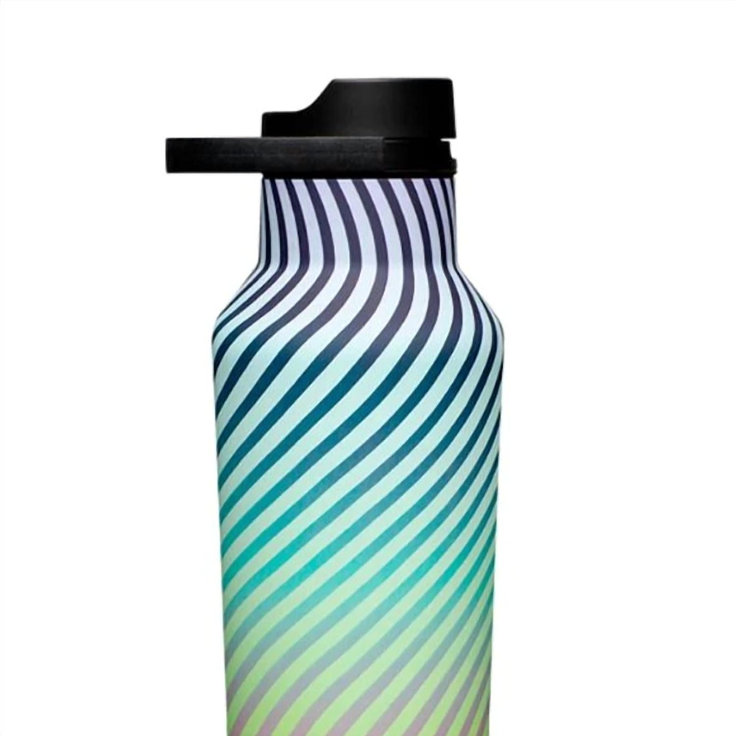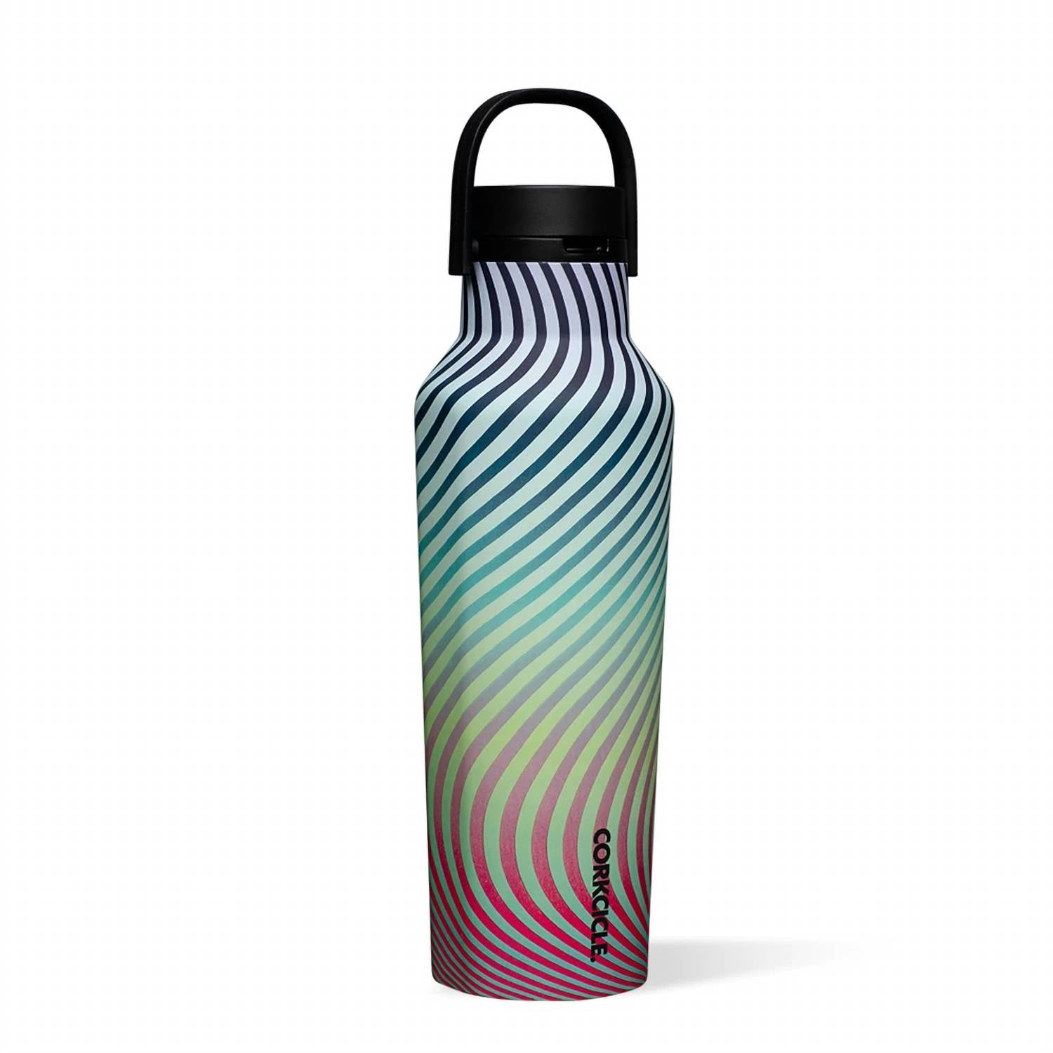 Introducing the Series A Sport Canteen Insulated Water Bottle by CORKCICLE, a stylish and functional accessory in a vibrant Kaleidoscope color. This water bottle boasts a stainless steel composition with triple insulation, keeping beverages cold for up to 25 hours. It features a convenient folding handle, quick sip cap, and a wide mouth that accommodates ice cubes effortlessly. With a durable DURAPRENE™ finish, it measures 2.68 inches in length, 3.07 inches in width, and 10.59 inches in height, weighing 1.03 pounds. It is dishwasher safe for easy care. Volume capacity: 20oz.