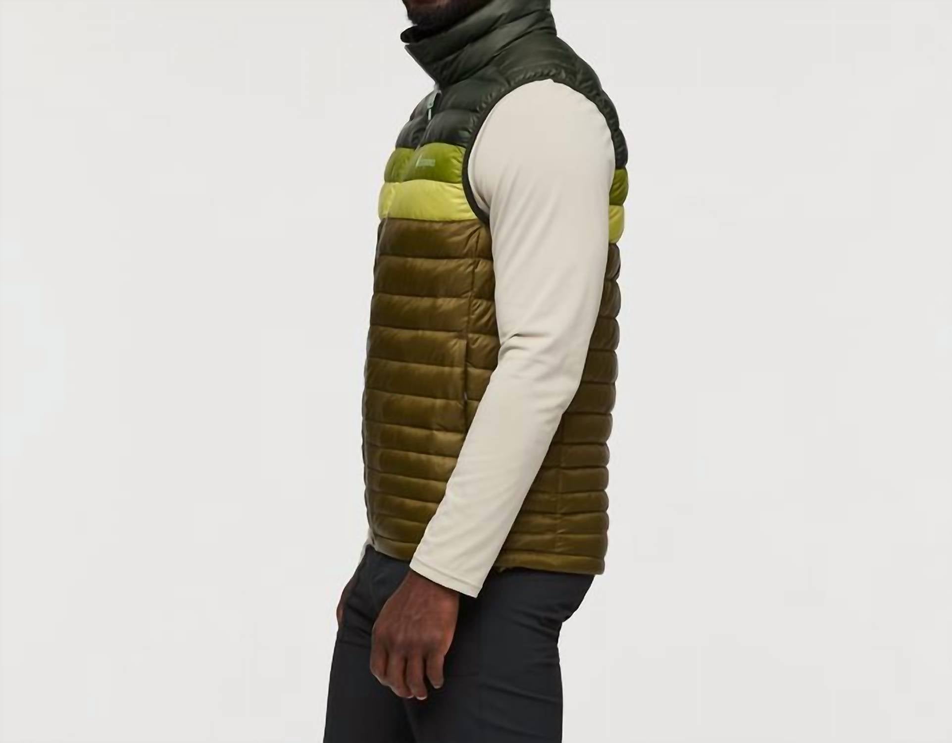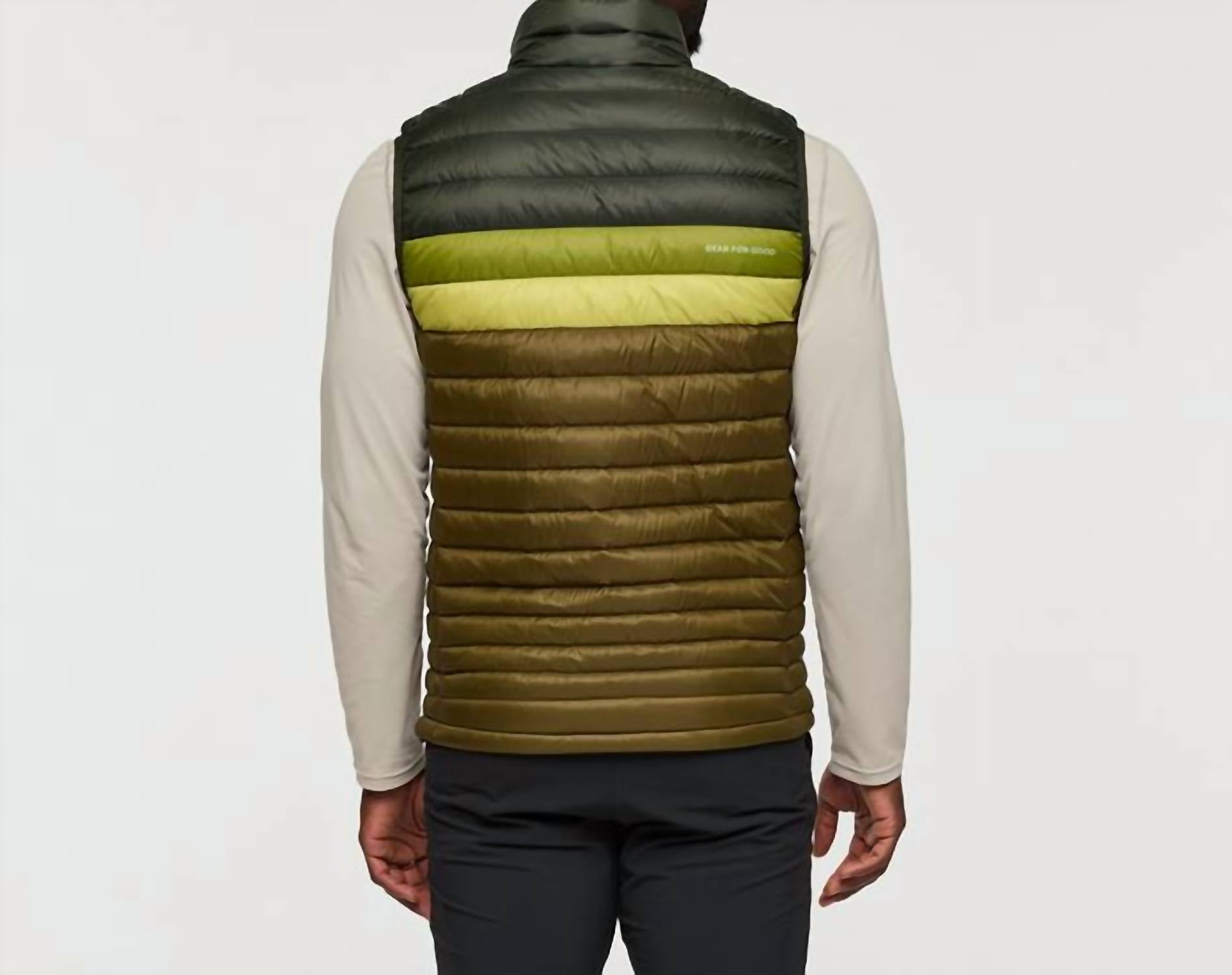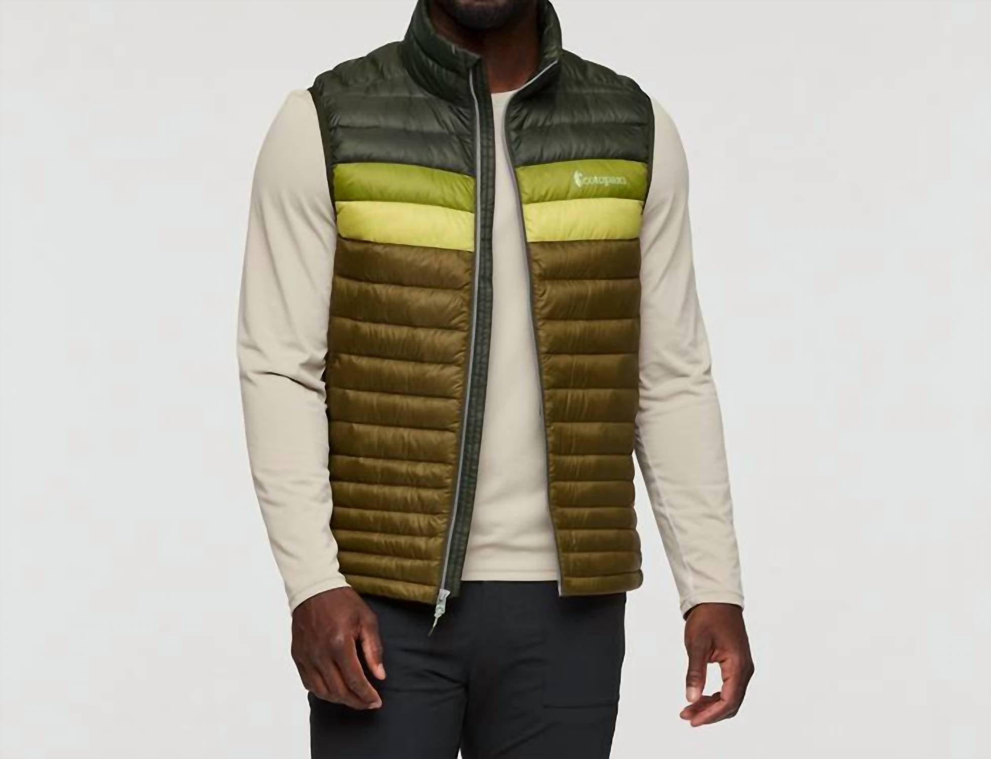 Embrace the outdoors with the Cotopaxi Fuego Down Vest in Woods/Live Oak, perfect for winter camping. This sleeveless vest features a chic striped pattern and a cozy mockneck, ideal for keeping warm. Closure: Secure with the convenient zip closure. Style it with ease for your next adventure.