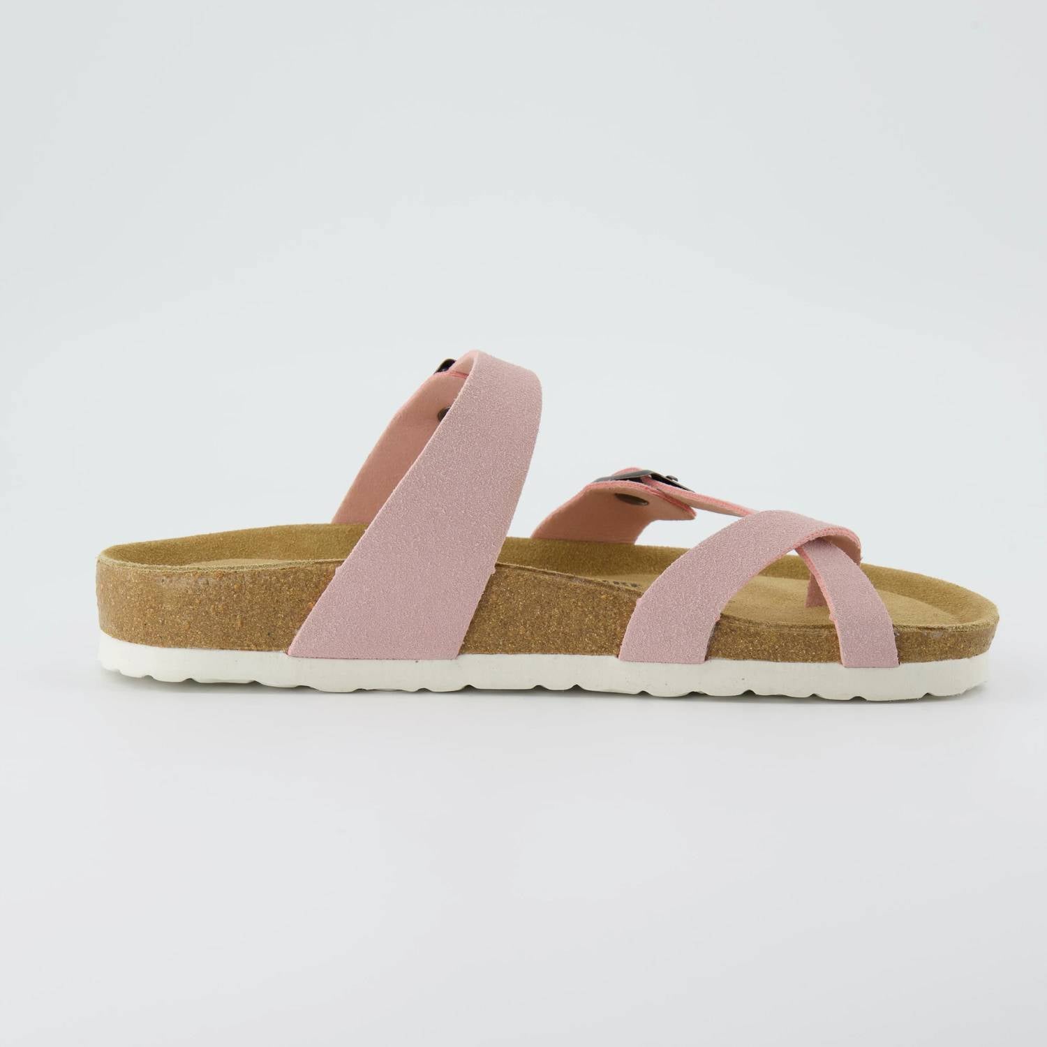 Introducing the Women's Luna Cork Footbed Sandals by Cushionaire, a blend of comfort and style. These sandals feature a soft pink vegan suede upper with open toe design and adjustable straps for a tailored fit. With a 1.25-inch platform, the fully cushioned genuine leather insole and cushioned heel cup offer long-lasting comfort. The flexible cork footbed is enhanced with a durable, traction EVA outsole, ideal for beach days and summer outings.