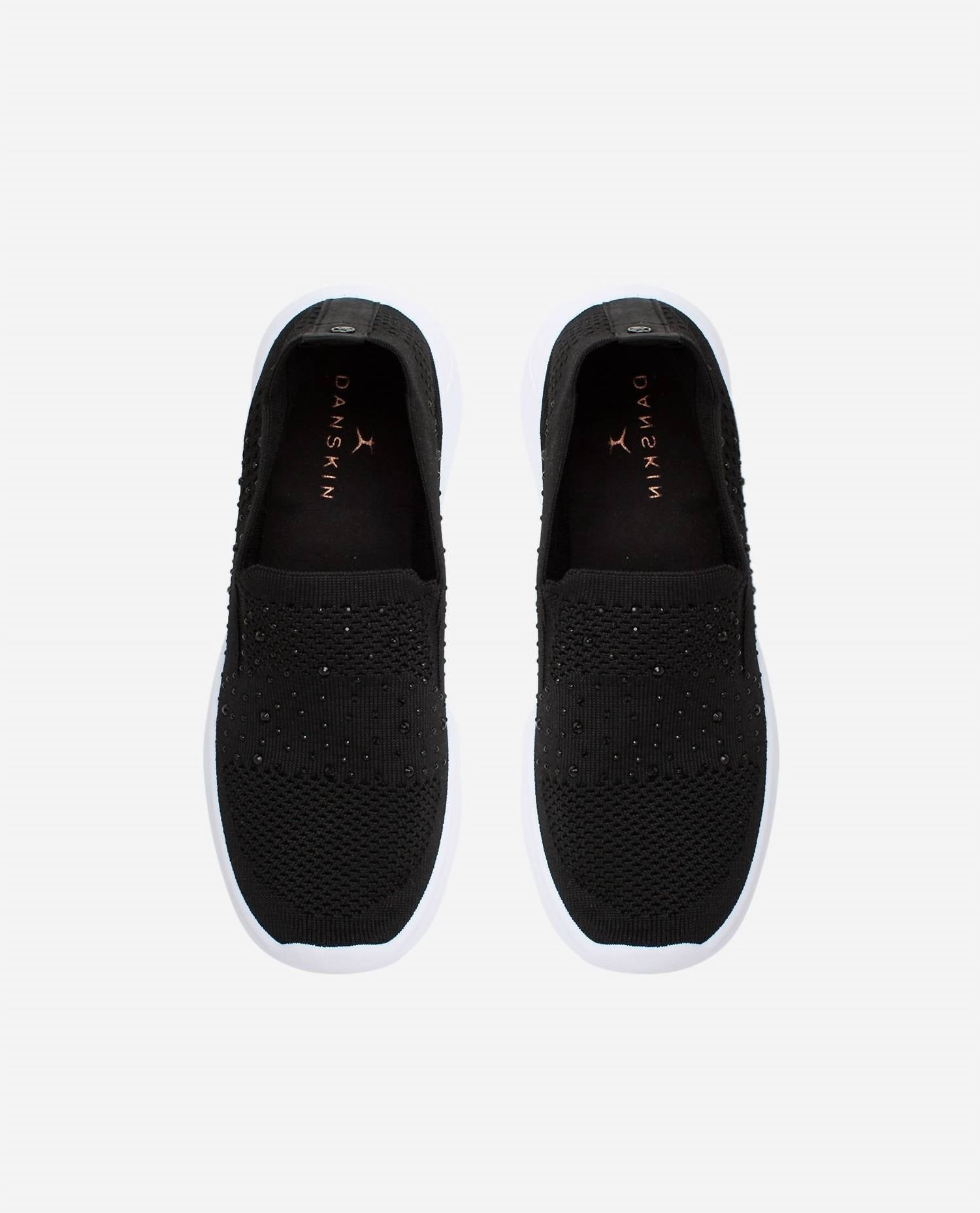 Step into style with the Danskin Women's Zest Slip On Sneaker, an essential for the minimalist traveler. Designed with 100% polyester fabric and a durable rubber sole, this shoe offers a comfortable slip-on style that fits true to size. The low heel height (1 1/4"-2") and round toe shape provide all-day ease, adorned with chic rhinestone embellishments for a touch of elegance. Care is hassle-free; simply wipe clean to maintain its sleek black finish.