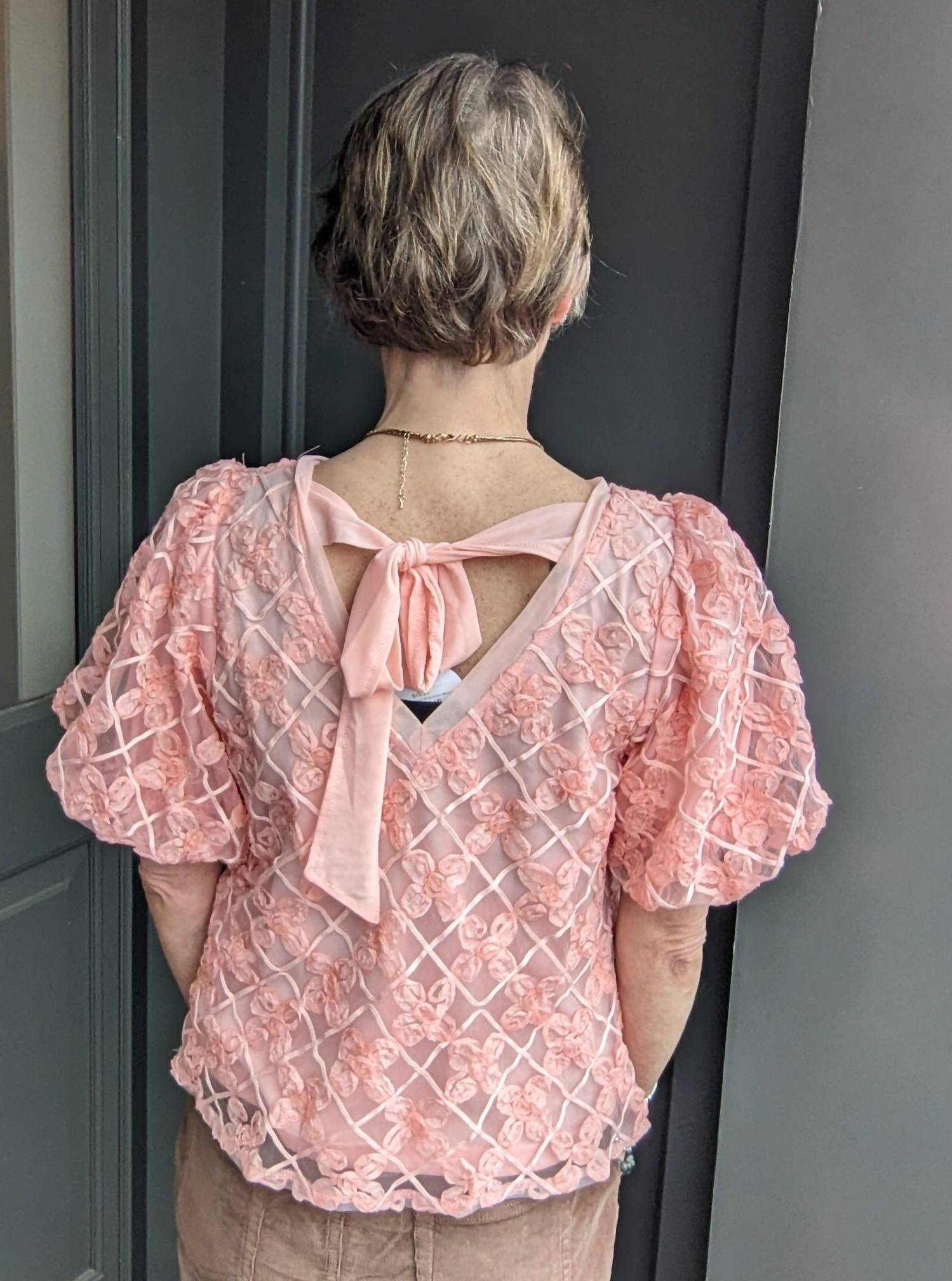 A timeless blouse that will never go out of style.100% Polyester. Textured and sheer top layer. Opaque lining. Silky tie back. Puff sleeves.