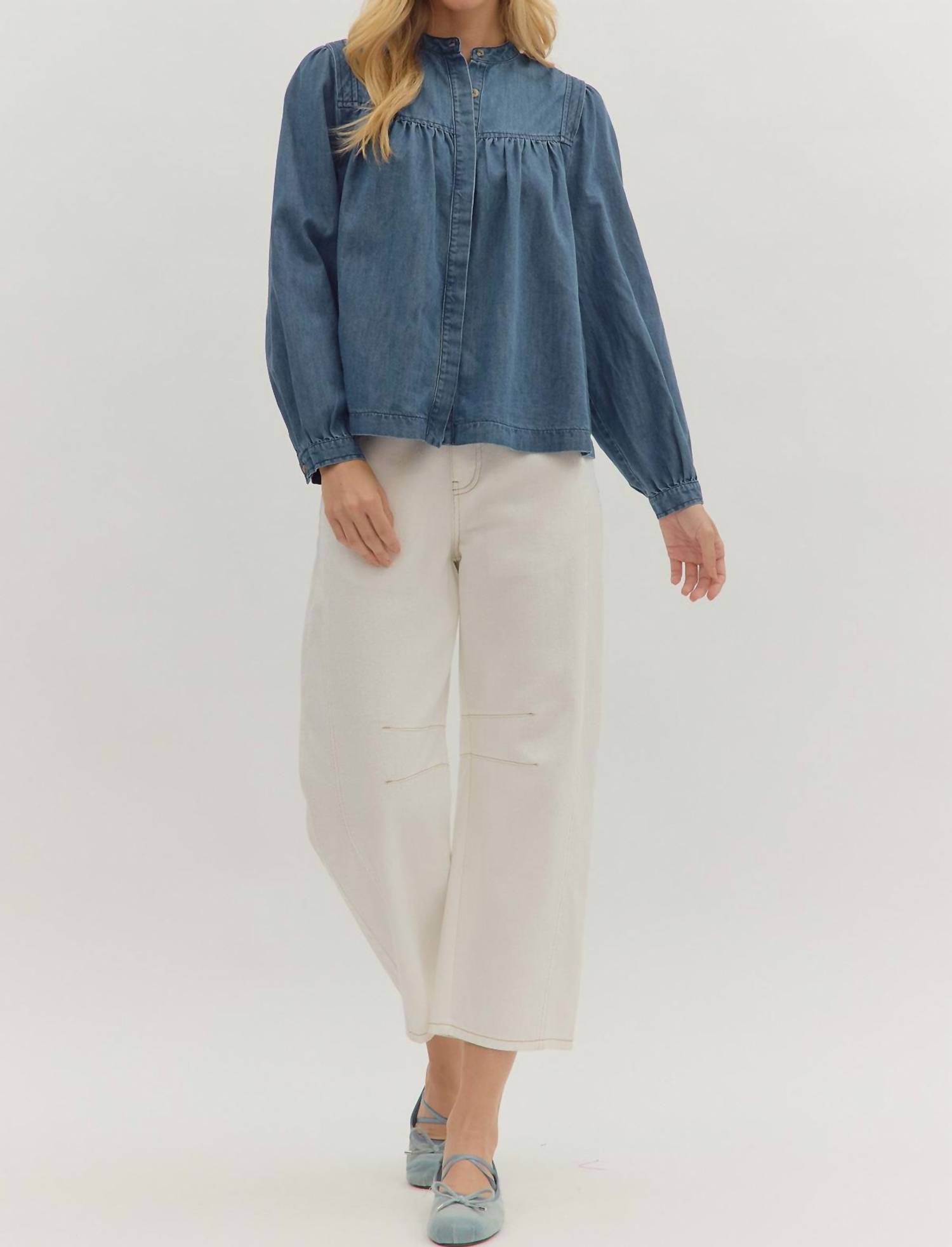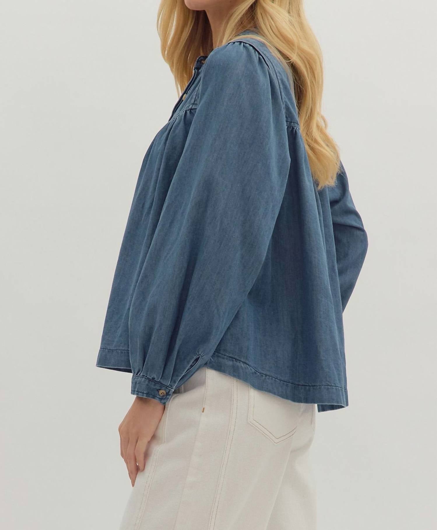 Elevate your workwear wardrobe with the Abby Long Sleeve Denim Top by Entro, a sophisticated choice for any dinner party. It features long sleeves and a mockneck, crafted from solid denim for a classic look. The top fastens with a secure button closure, adding an element of sleekness to your outfit. Care is simple with machine wash and tumble dry instructions, making this a practical yet stylish addition to your closet.