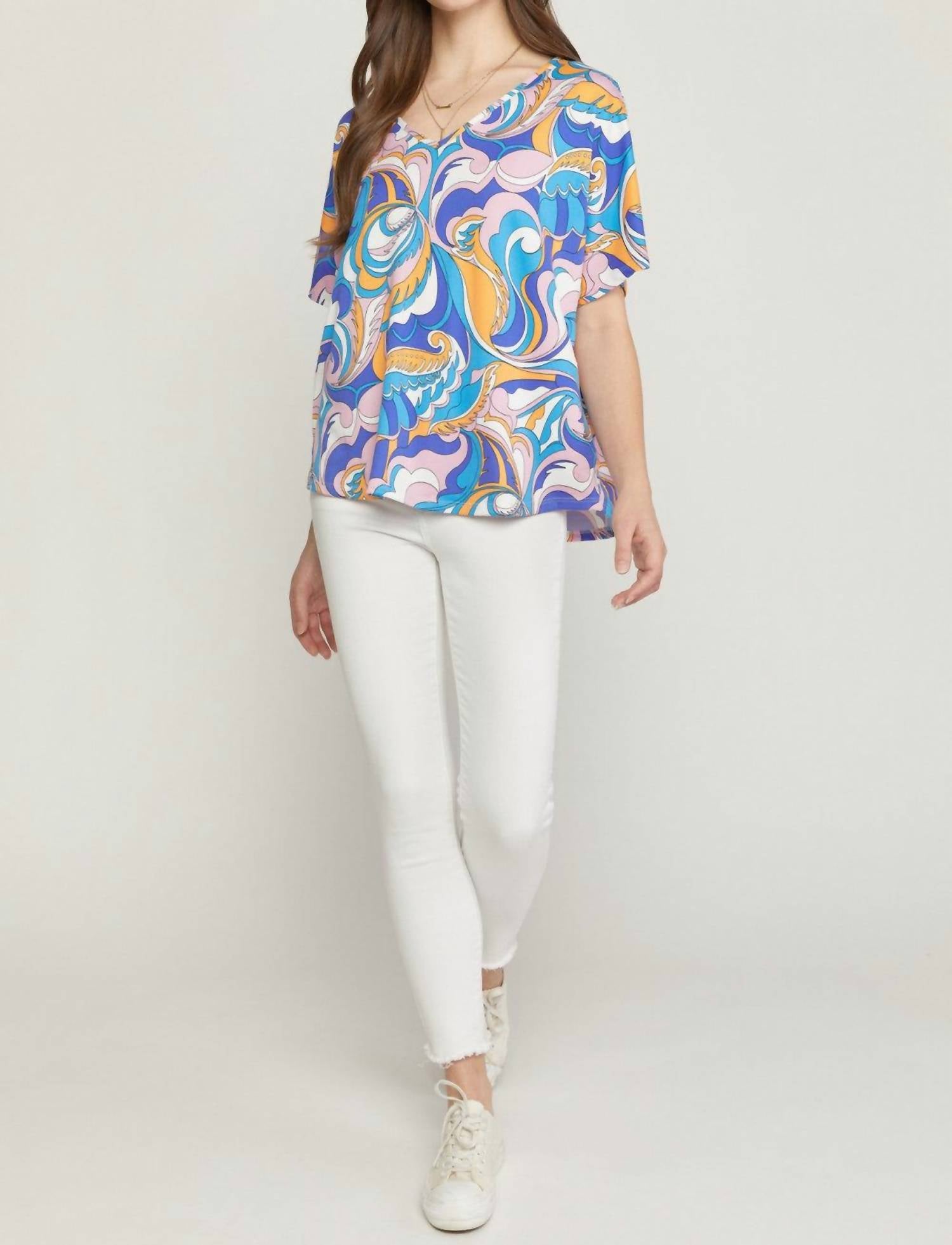 Short sleeves. V-neckline. Colorful abstract print. Relaxed oversized silhouette. Lightweight. 96% Polyester, 4% Spandex, soft and stretchy fabric. Hand wash or dry clean. Made in the USA.