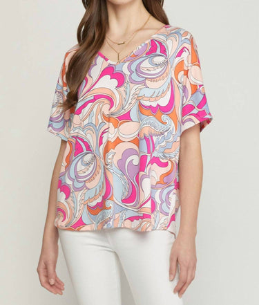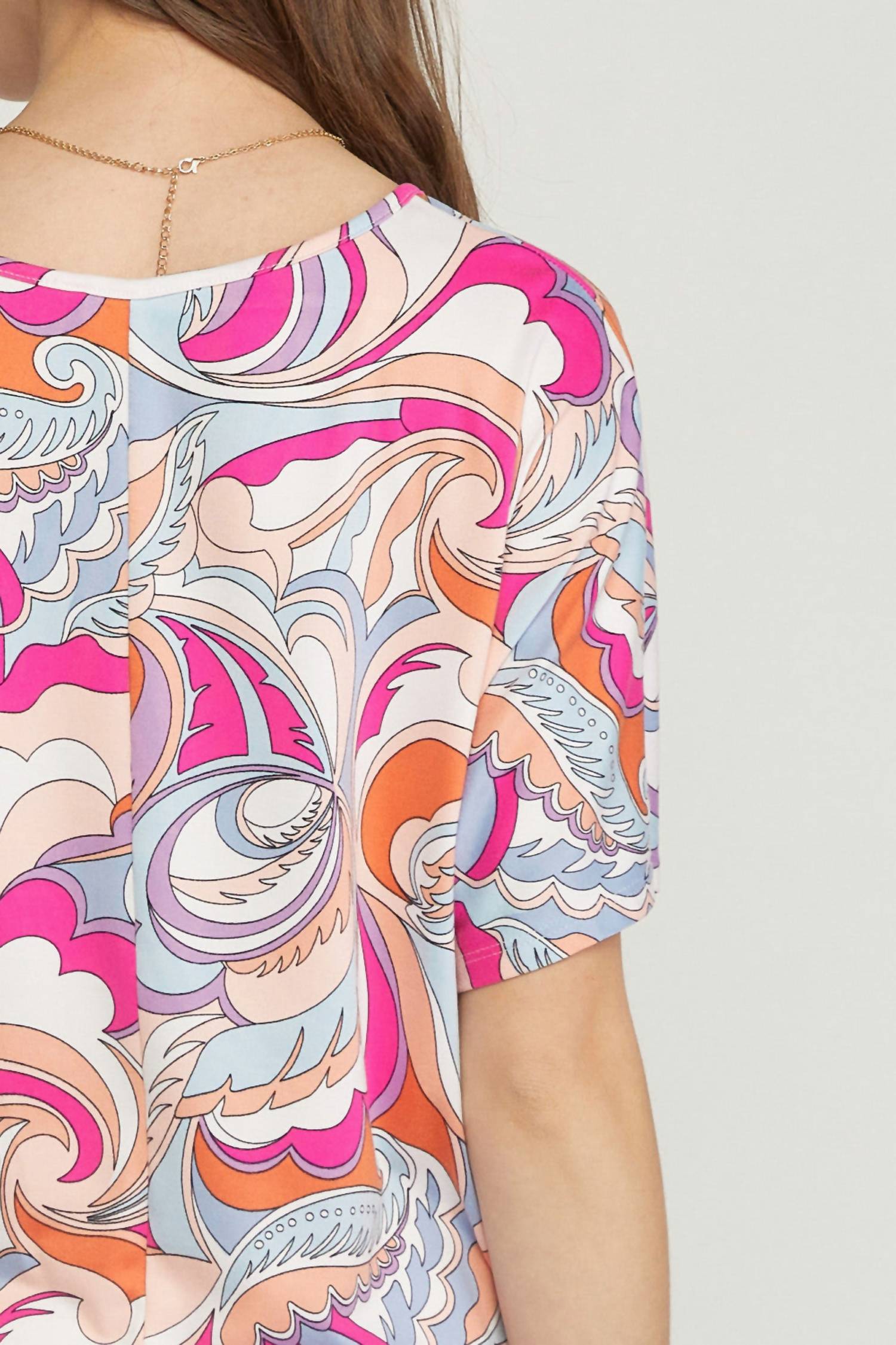 Vibrant piece perfect for any closet. Featuring short sleeves and a relaxed, oversized silhouette. Crafted from 96% Polyester and 4% Spandex, offering a comfortable, stretchy fit. Garment length is 25 inches. Colorful abstract print that's sure to turn heads. Finished with a convenient pull-on style. Requires hand washing or dry cleaning.