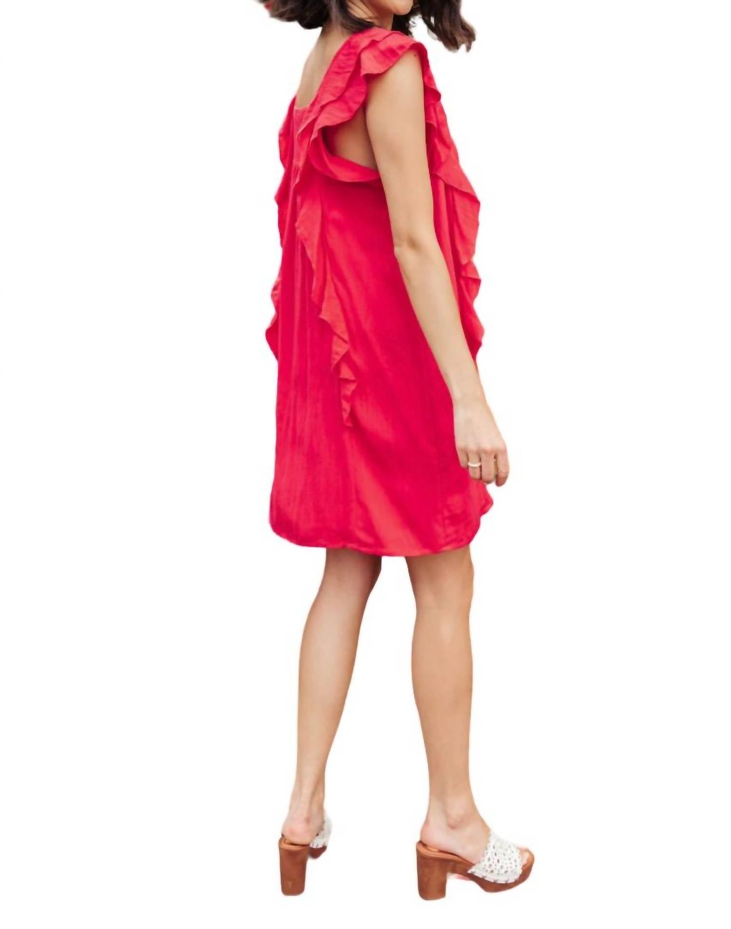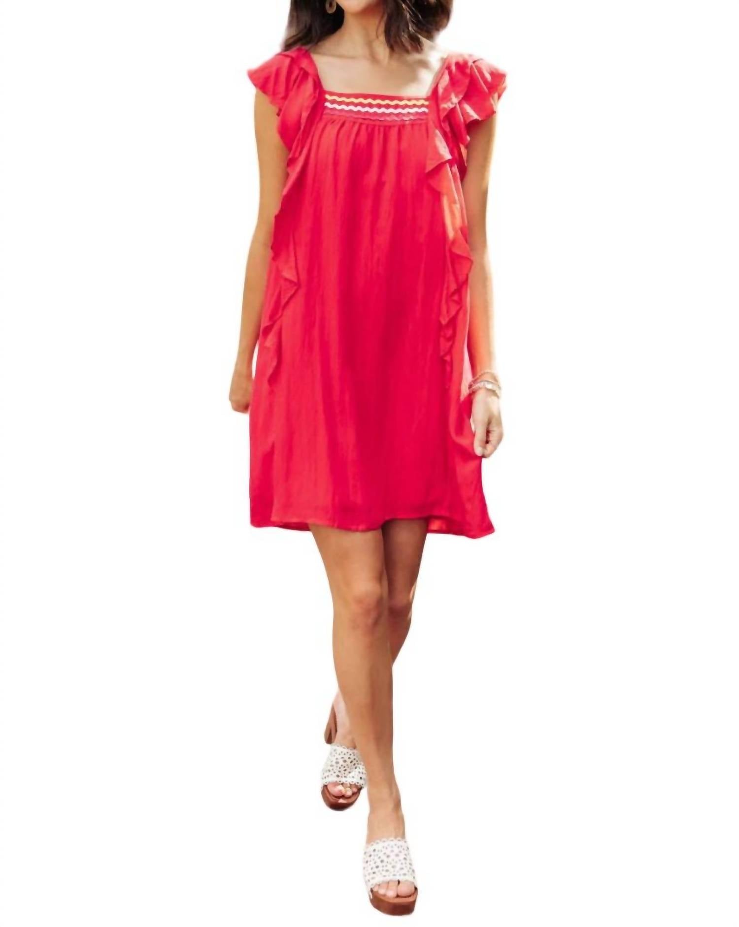 The kind of easy and flattering dress you'll be reaching for all season long.Square neckline with embroidered details. A-line dress. Medium Weight. Fully Lined. Ruffle Detail. Flutter Sleeves. Self: 50% Rayon, 50% Polyester. Lining: 100% Polyester. Wash Cold, Hang Dry. Fits True To Size.