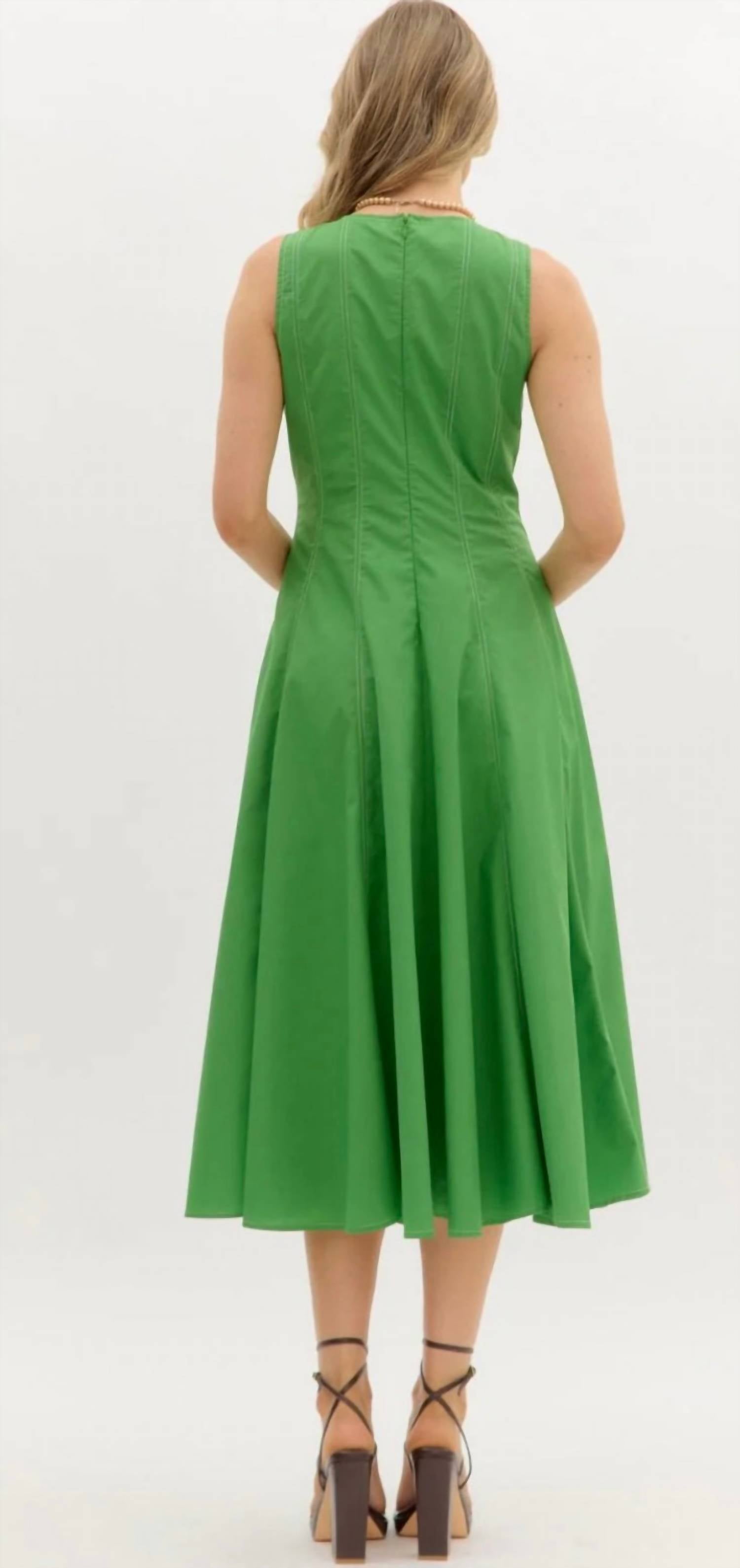 Introducing the Green Vineyard Dress by Entro, a stunning sleeveless piece that embodies minimalist elegance. This fit and flare midi dress features a distinctive square neckline and exposed stitching details for added style. With a convenient zip closure at the back, it offers a seamless blend of comfort and sophistication. Ideal for fall events like Thanksgiving, this lightweight dress is both woven and non-sheer, making it a versatile addition to any wardrobe.