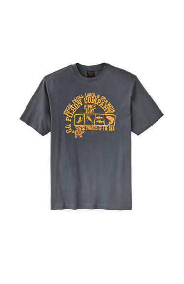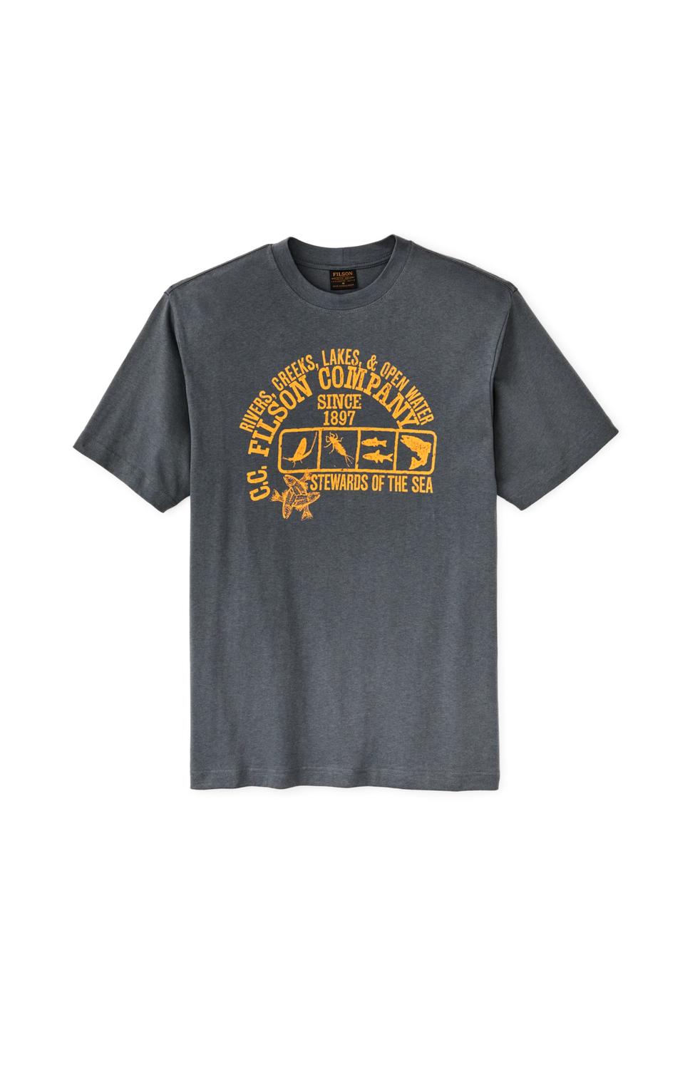 The Men's Frontier Graphic T-shirt by FILSON in Storm Blue and Stewards is an ideal choice for streetwear and travel enthusiasts. Made from sturdy 6.5-oz. 100% cotton jersey knit, this short sleeve tee ensures year-round comfort with its 1x1 rib-knit crewneck collar. Featuring unique custom graphics, the shirt provides both style and casual wearability. Made with a pull-on closure, it is easy to maintain with machine washing.