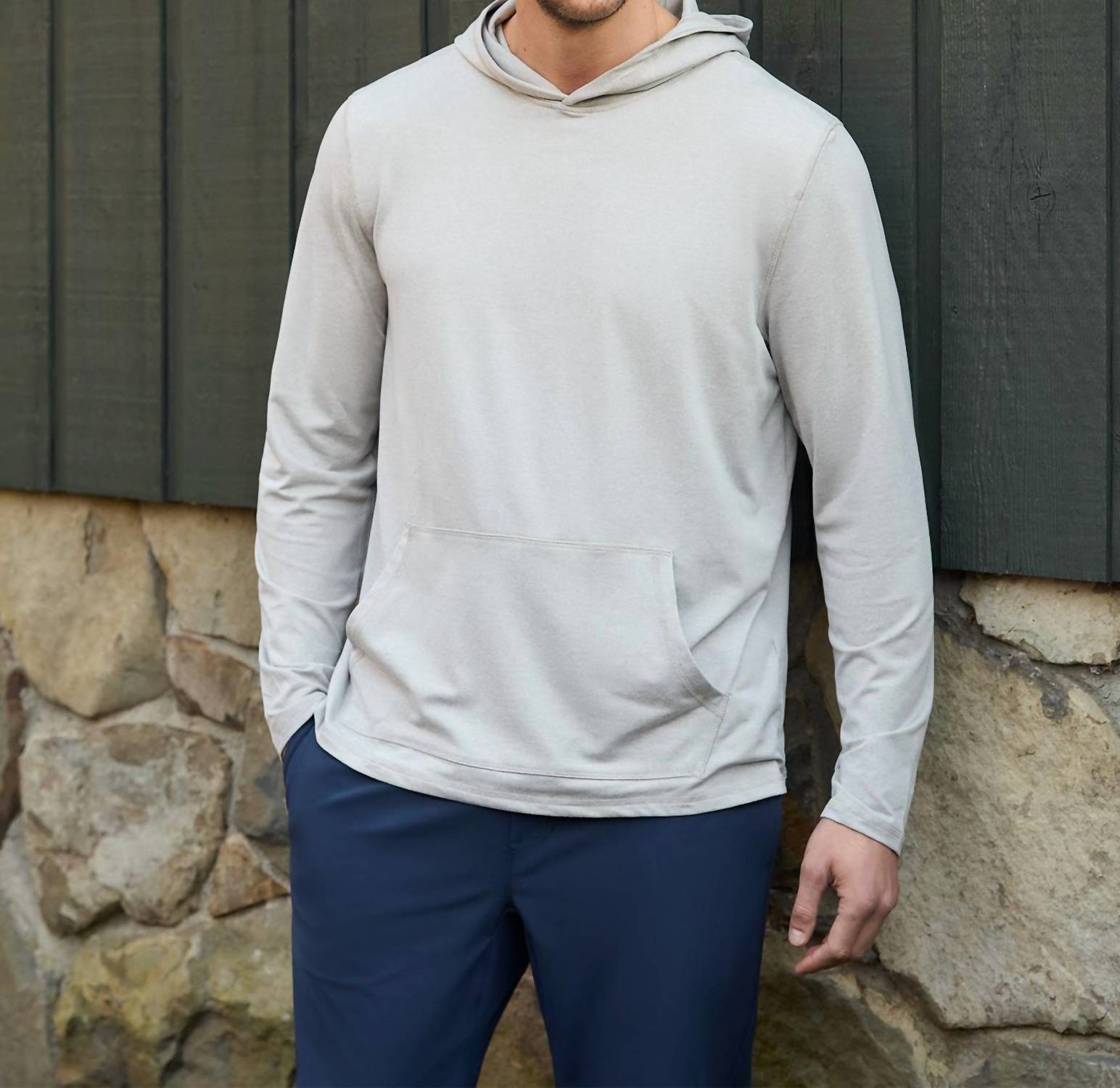 Experience ultimate comfort with the Clutch Comfort Hoodie by Flags & Anthem, perfect for your active lifestyle. This light grey, long sleeve hoodie is crafted from a soft and stretchy blend of 90% polyester and 10% spandex, ensuring a streamlined fit. It features a functional kangaroo front pocket and offers a 28.5-inch length from the highest point of the shoulder. Made for effortless style, this solid pattern piece is imported with a convenient pull-on closure, and is machine washable for easy care.