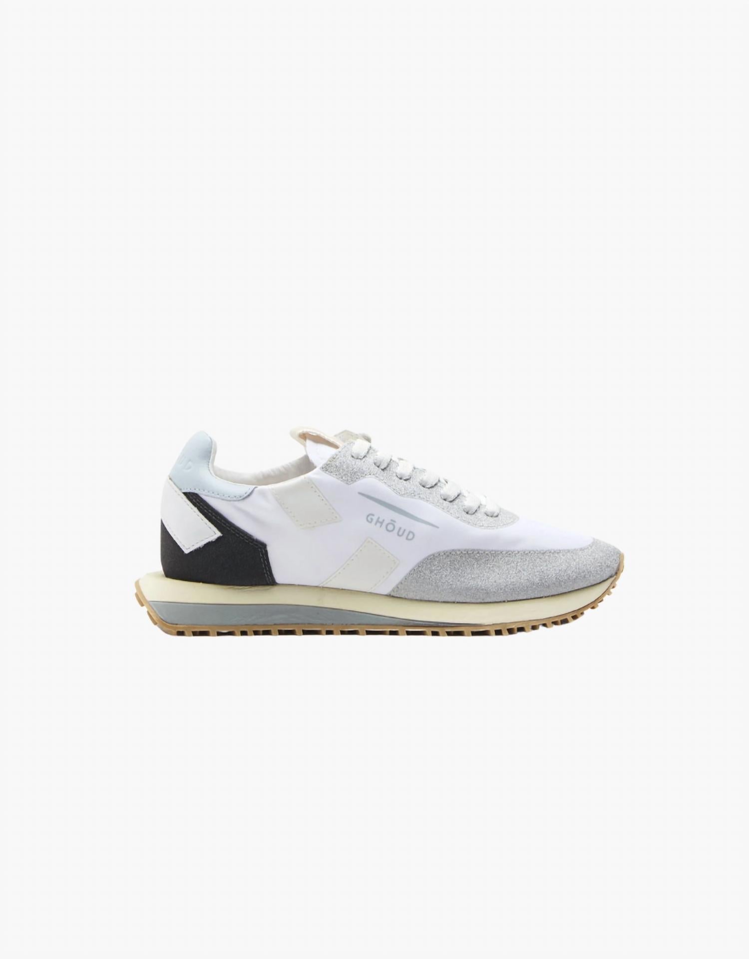 Step into style with the Women's Rush Low Starlight Sneakers by Ghōud, boasting a striking Phylon Silver Black aesthetic. The sneakers feature a nylon upper with glitter details for a touch of sparkle, set against clean geometric lines. Crafted with a micro multicolor sole and rubber outsole, they provide durability and flair.