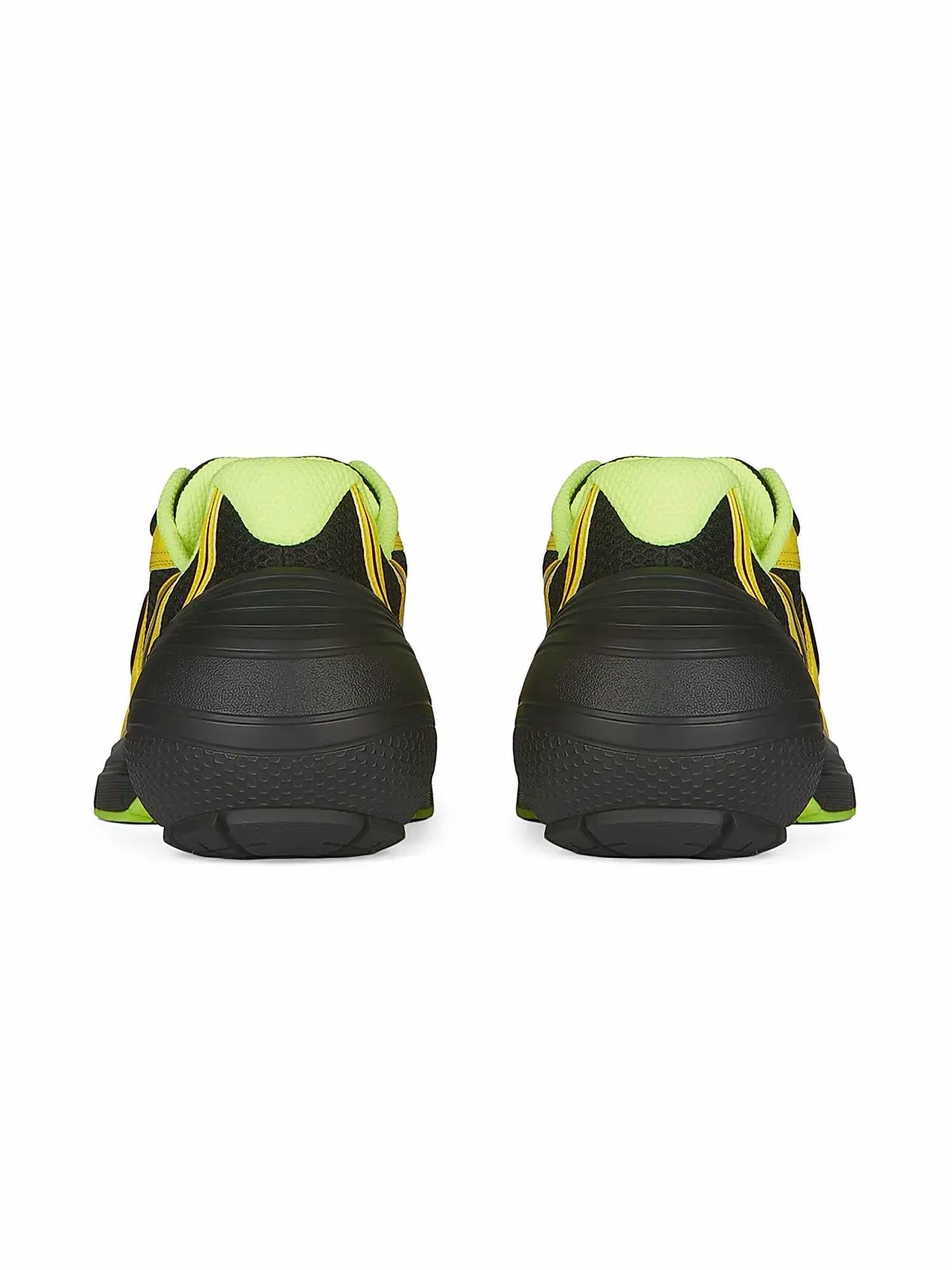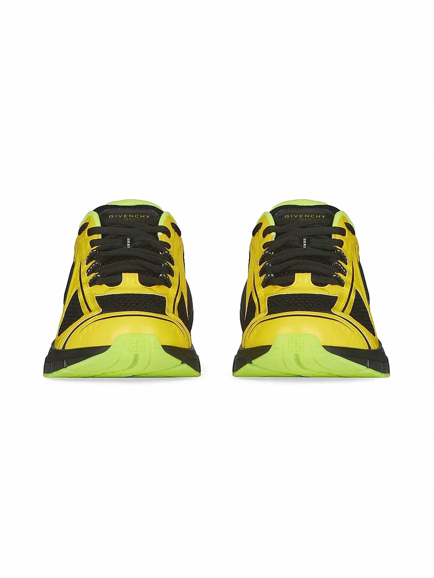 The Givenchy Men's TK-MX Runner Sneakers in vibrant yellow and black are a striking addition to your athleisure collection. Crafted from a blend of 53% polyurethane, 27% polyester, and 20% cotton, these sneakers are designed for technicity and lightness. Featuring a lace-up design, they boast a thick graphic rubber sole embossed with the iconic Givenchy signature and subtle branding details on the side bubble patch, tongue, insole, and outsole. Made in Italy, these summer-ready sneakers have a low heel height and are perfect for fitness and workouts.