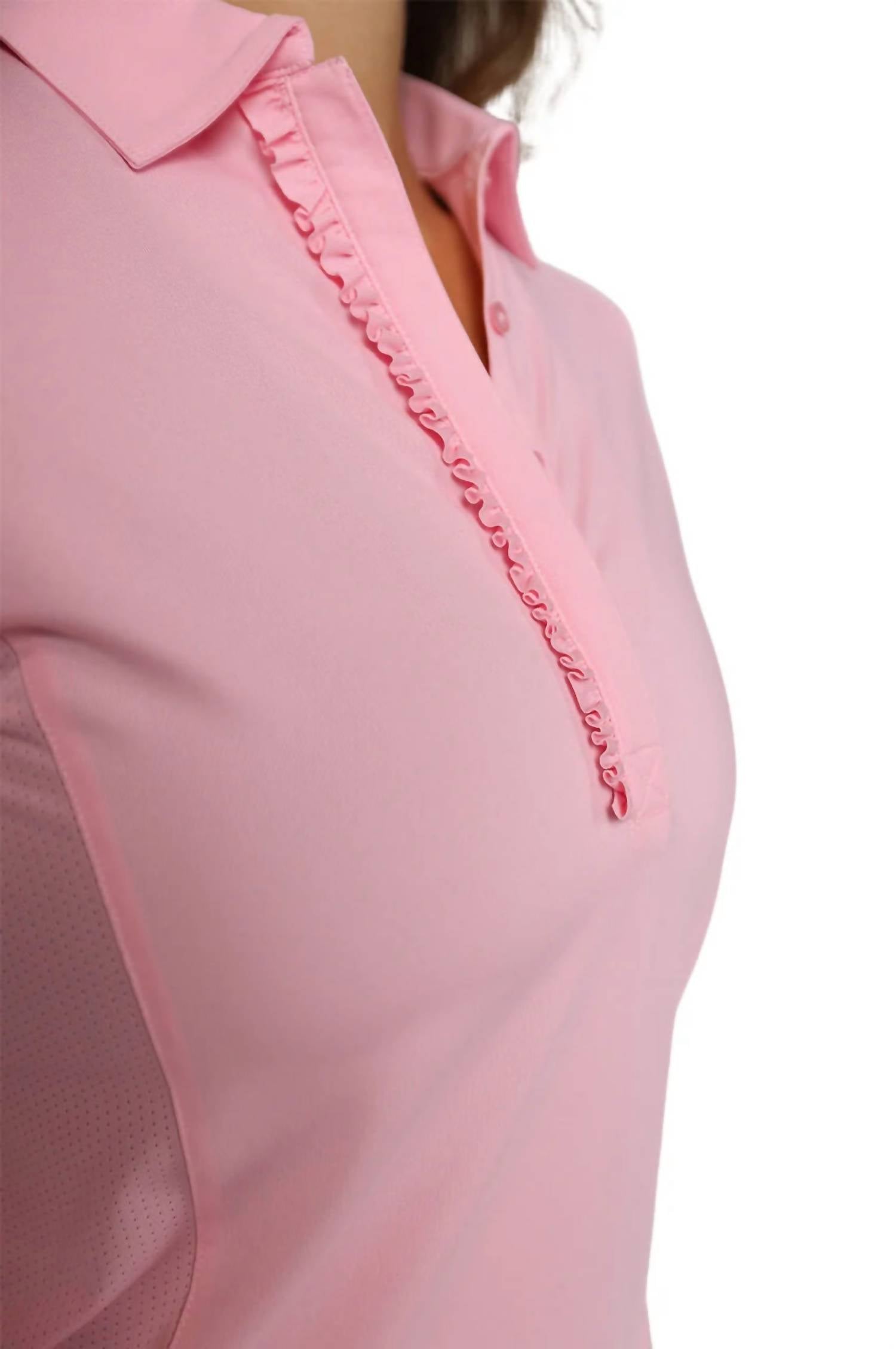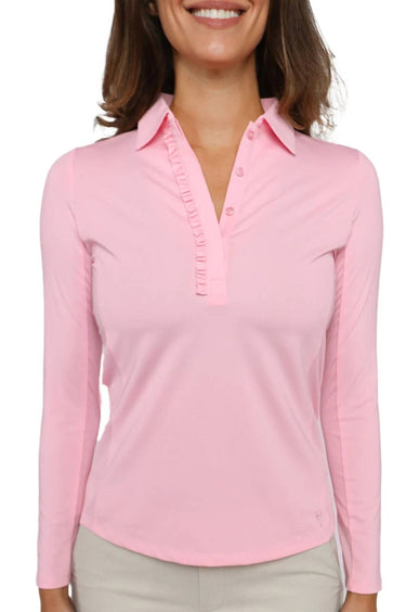 Elevate your golf attire with the Long Sleeve Ruffle Polo by Golftini, crafted in a delicate light pink shade. This stylish women's activewear features long sleeves and a stunning ruffle placket, complemented by hidden button closure and princess seams for a flattering silhouette. Constructed from 95% polyester and 5% spandex, this polo provides moisture-wicking, wrinkle-free comfort with UPF 30+ protection. Ideal for summer workouts, it offers a perfect blend of fashion and function. Care: Machine wash and line dry for best results.