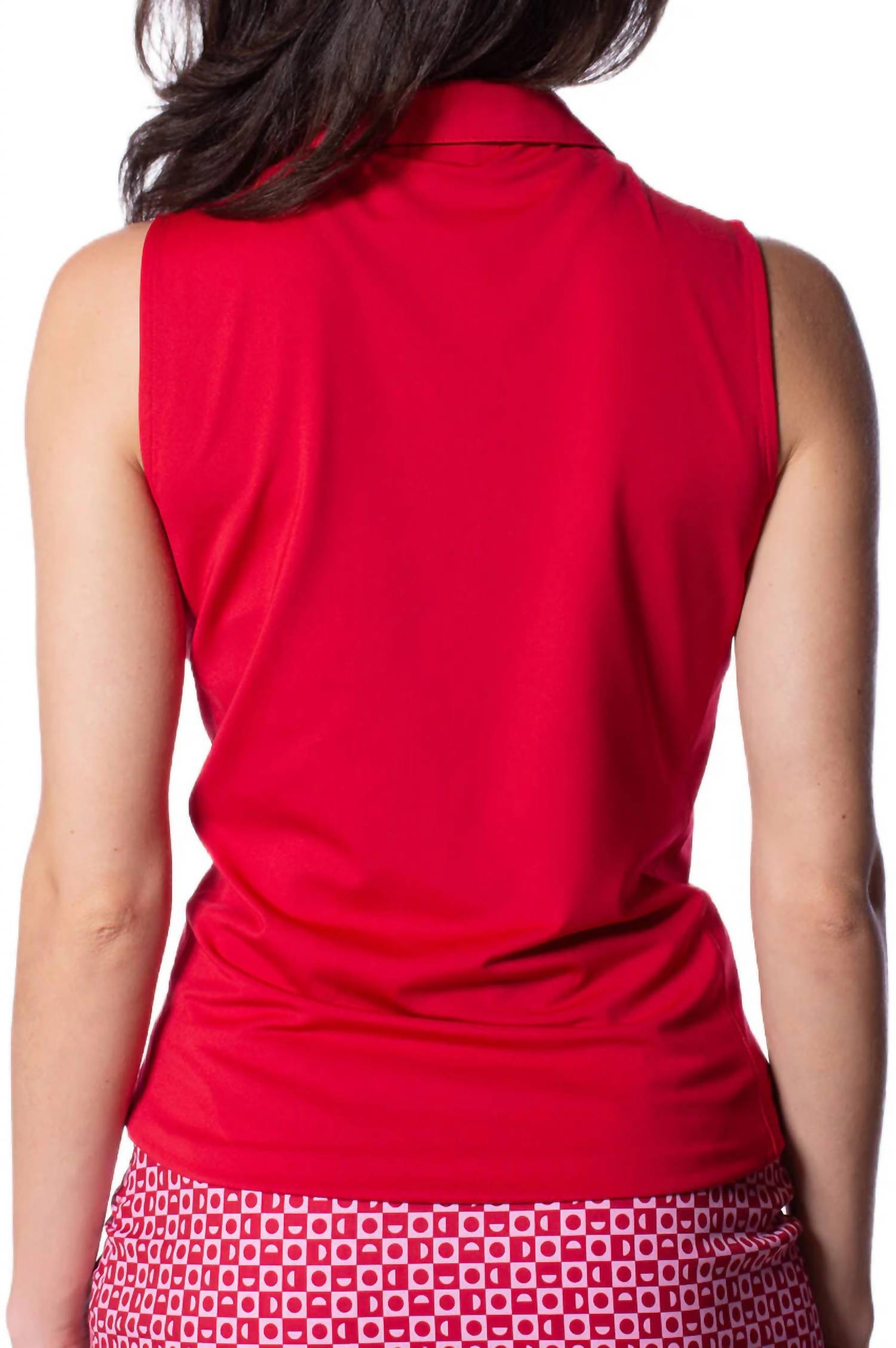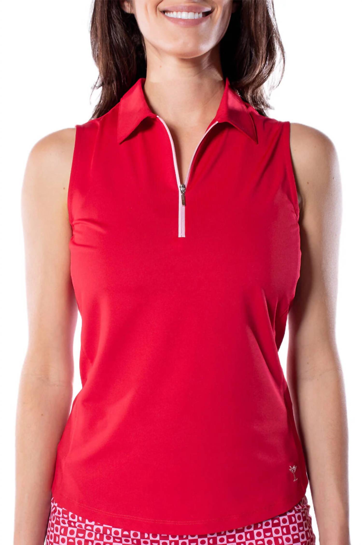 Experience tailored comfort and style, perfect for active women. Red, sleeveless polo features a flattering v-neckline accentuated by a contrast light pink quarter zipper. Crafted from breathable polyester with 4-way stretch and moisture-wicking properties, provides UPF 30+ sun protection, making it ideal for your outdoor ventures. Enjoy hassle-free care with machine wash and line dry instructions.