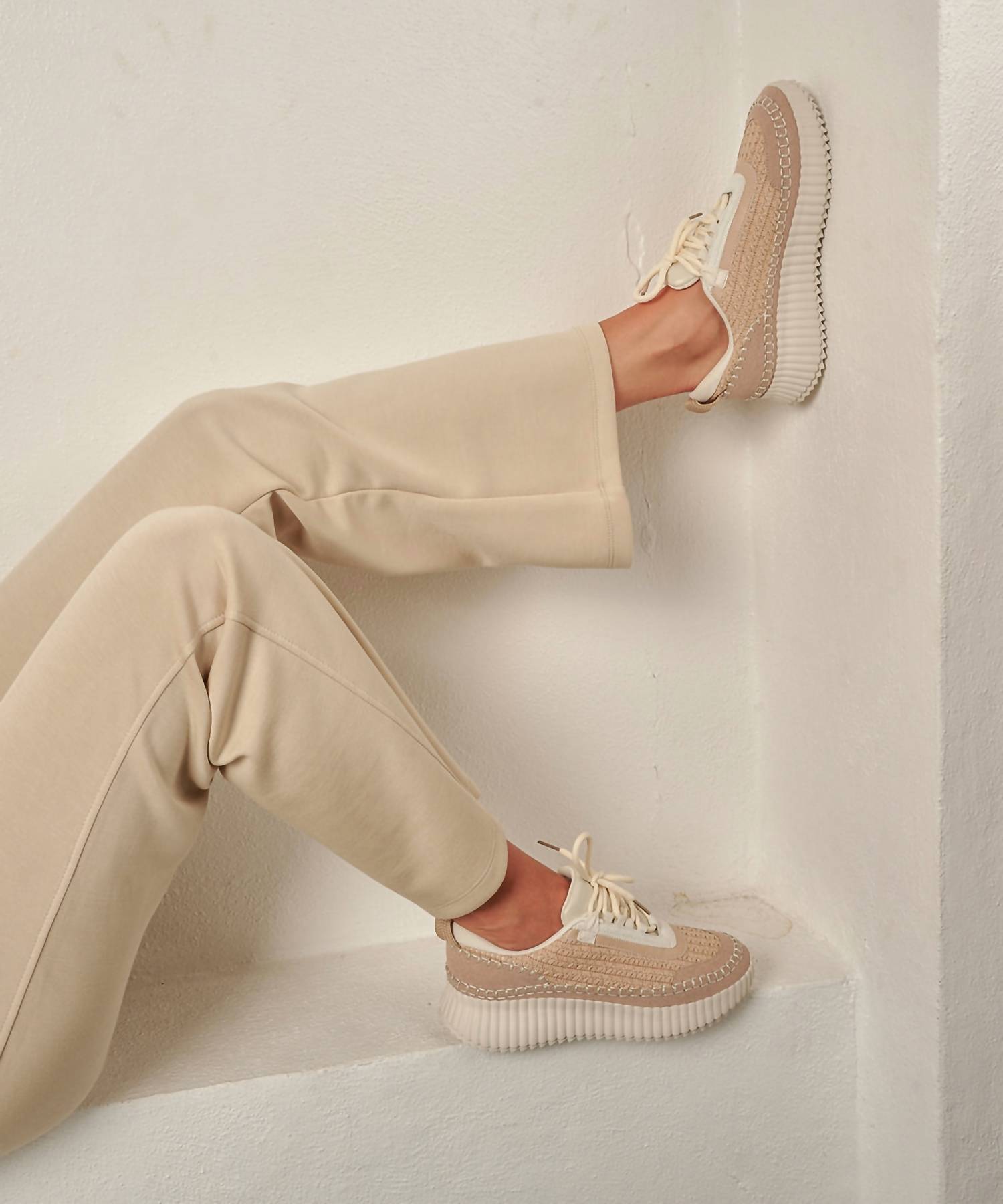 Introducing the Women's Adventure Sneaker by Hey Girl from Corkys, a must-have for those on the go with a perfect blend of style and comfort. These sneakers boast a sporty knit upper in a neutral beige, perfectly paired with a chunky white ribbed sole and intricate crochet details for a touch of elegance. Designed with a platform heel for a fashionable lift and a round toe for comfort, these slip-ons are ideal for travel and summer adventures. Embrace athleisure style with these chic, breathable, and flexible sneakers that ensure every step is a breeze.