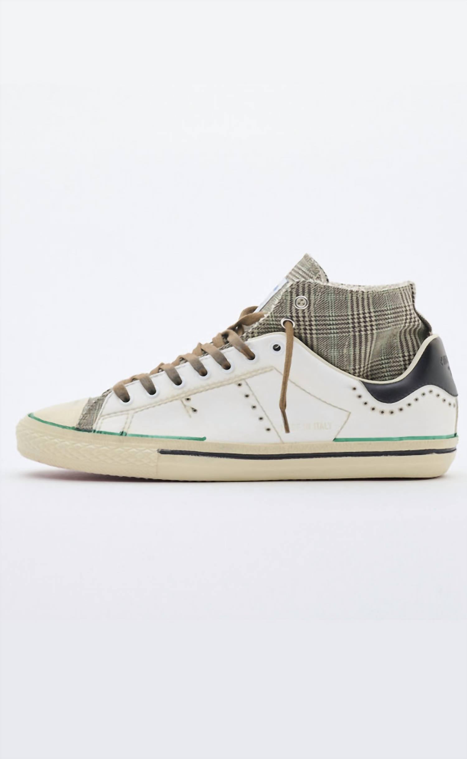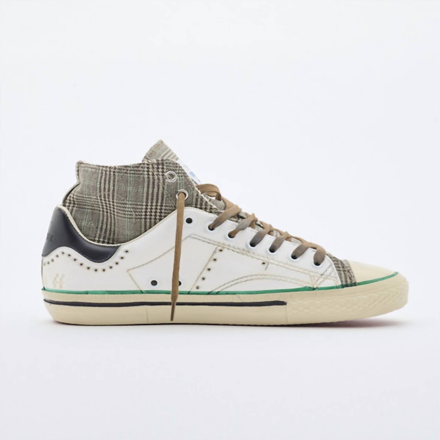 Introducing the Women's Starless High Moma Art Sneakers by Hidnander, a winter edition sneaker designed for style and warmth. Featuring a high-top design with a corduroy collar and tongue, and a fleece-lined upper for added comfort, this sneaker is perfect for cold weather. Made entirely in Italy with a classic retro rubber sole and iconic low-top silhouette inspired by the 1970s sneaker era. Embrace the grunge trend in this white, grey, and green tartan colorway with a round toe and flat heel, ideal for travel or New Year's Eve.
