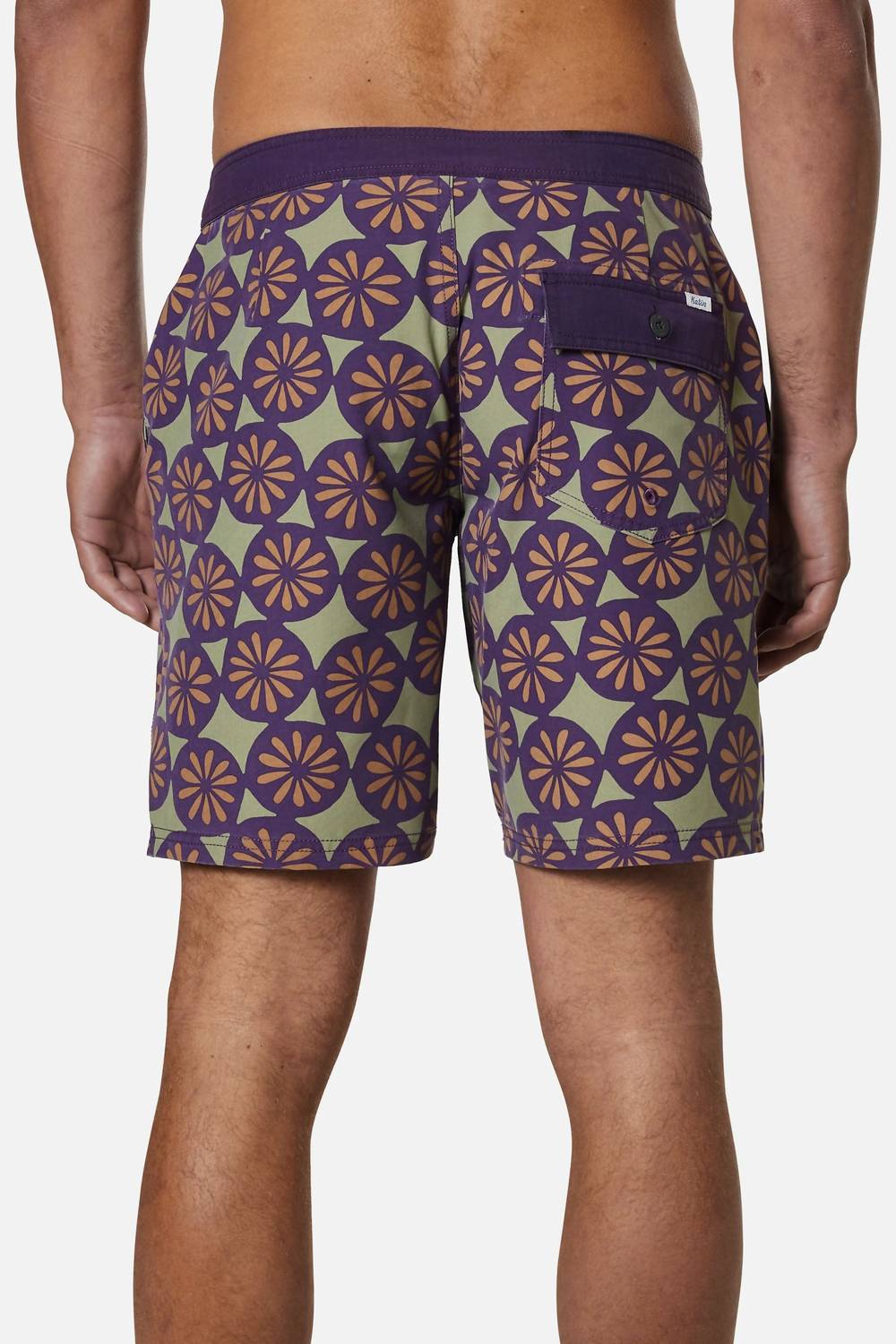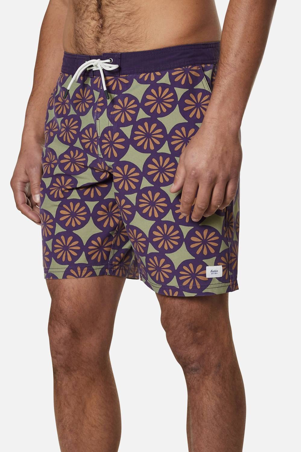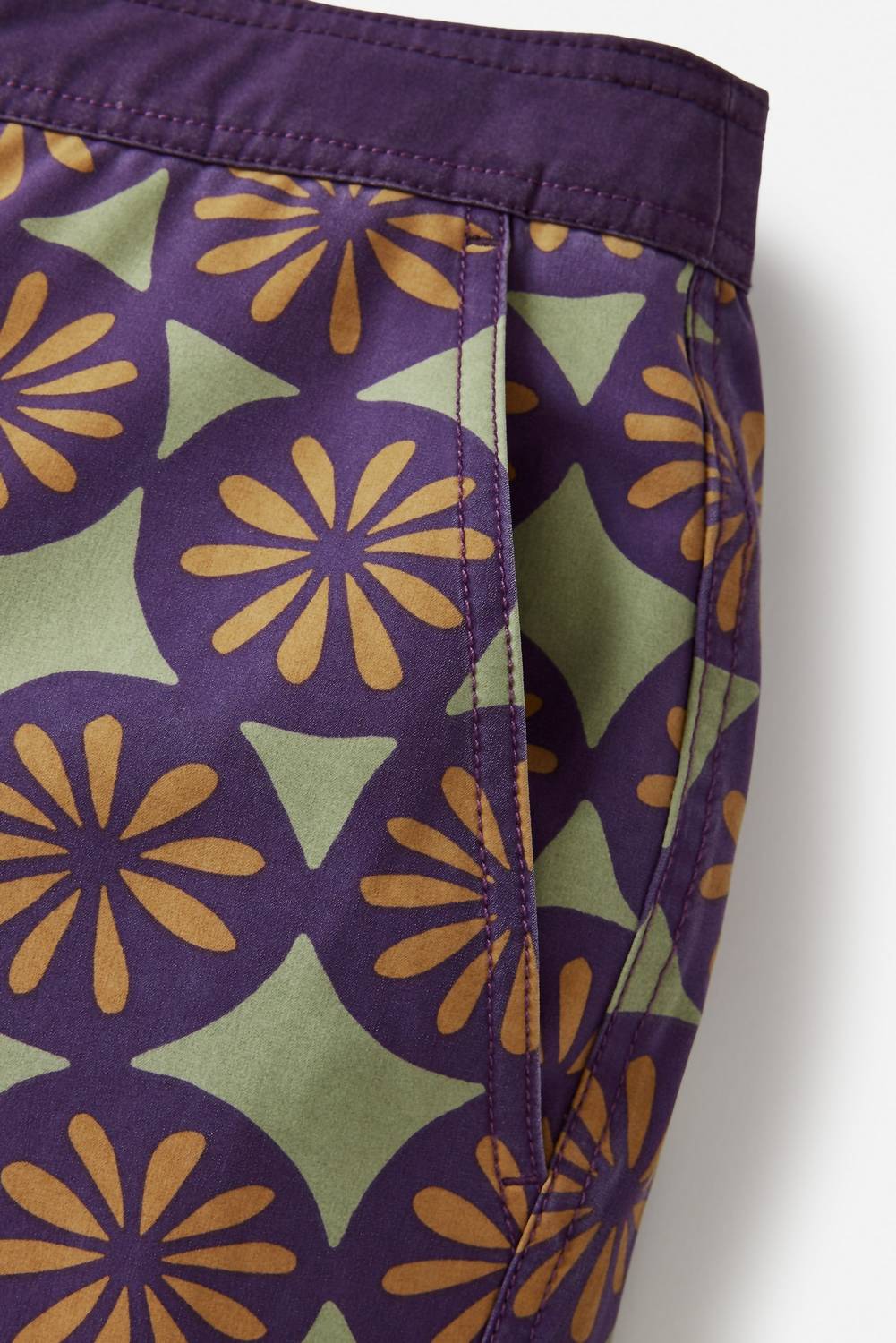 Introducing the Men's Pond Hybrid Trunk Short by Katin, crafted for summer streetwear with Repreve recycled polyester and spandex, offering a comfortable 4-way stretch. These patterned trunks in a refreshing plum feature an 18" outseam and a convenient interior stash pocket. Closure: Tie closure with a single button fly. This vacation-ready piece showcases a retro lily pad graphic, perfect for adding flair to your warm-weather wardrobe.