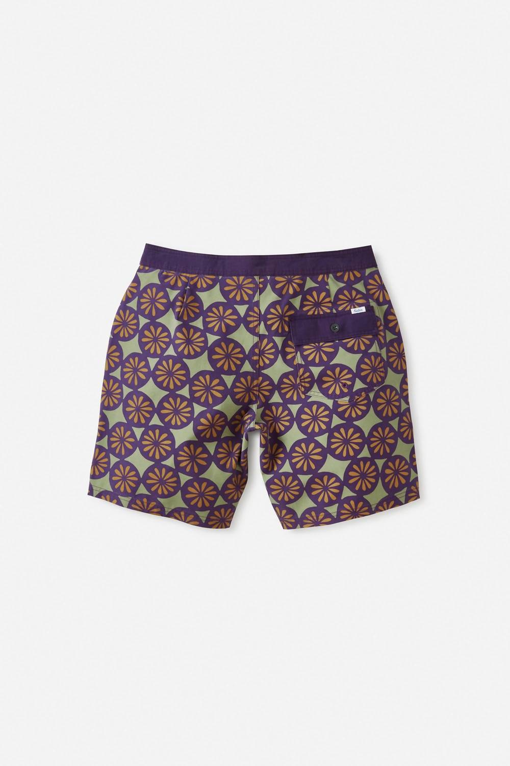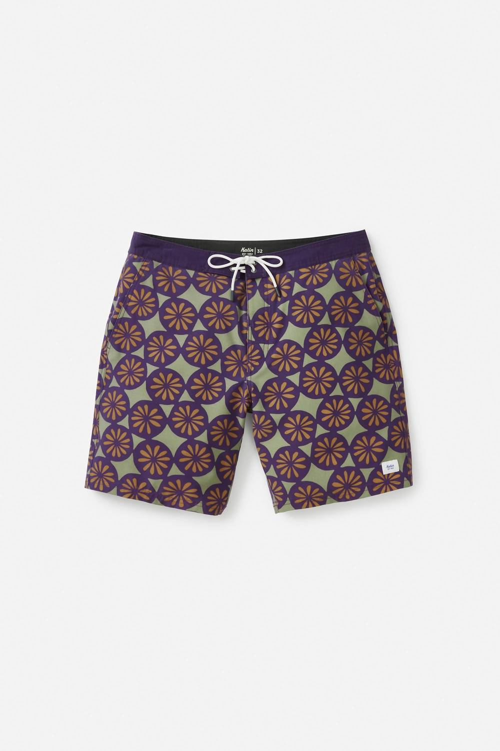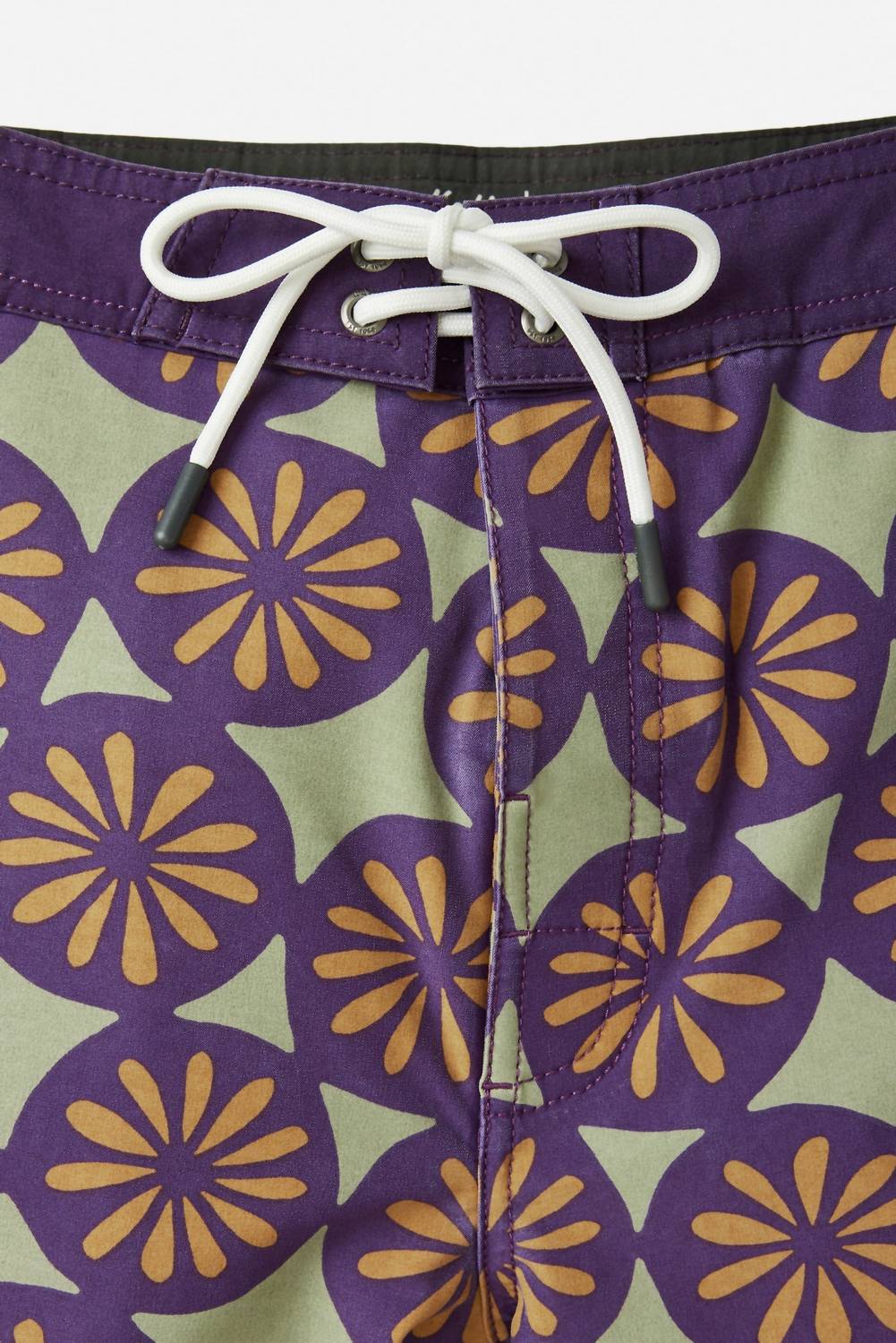 Introducing the Men's Pond Hybrid Trunk Short by Katin, crafted for summer streetwear with Repreve recycled polyester and spandex, offering a comfortable 4-way stretch. These patterned trunks in a refreshing plum feature an 18" outseam and a convenient interior stash pocket. Closure: Tie closure with a single button fly. This vacation-ready piece showcases a retro lily pad graphic, perfect for adding flair to your warm-weather wardrobe.