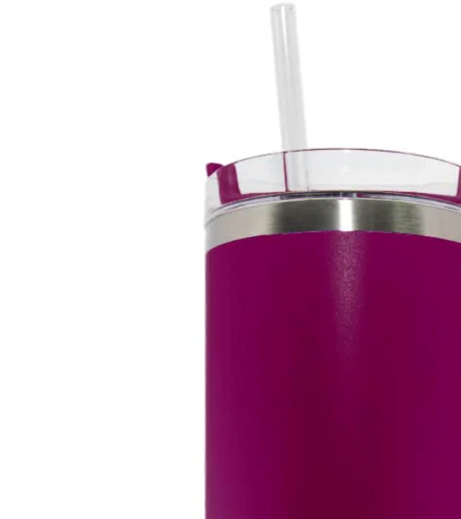 Introducing the Katydid 40 Oz Insulated Stainless Steel Tumbler with Handle, designed for both style and utility. This plum-colored tumbler keeps your drinks at the perfect temperature with its double-wall insulation. Featuring a sturdy stainless steel interior and a convenient handle, it fits easily in most car cup holders. Closure is ensured with a screw-on plastic top, and it includes a reusable straw with an adjustable cover for easy travel. Care: Dishwasher safe. The tumbler measures 3" in diameter at the base.