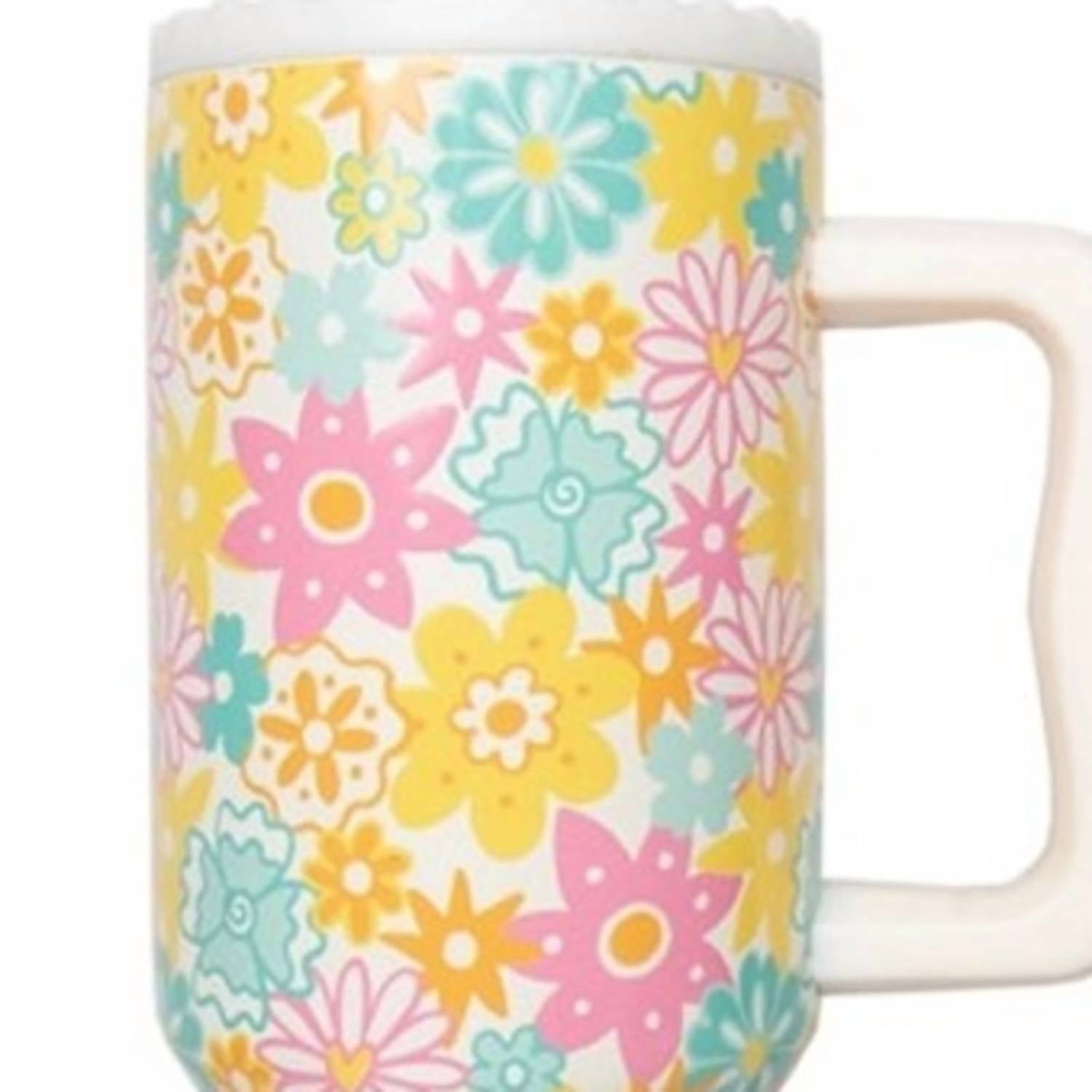 Introducing the Katydid Spring Retro Flowers Tumbler, perfect for those who love vibrant style and practicality. With a 38 oz capacity, this stainless steel tumbler keeps your drinks at the ideal temperature all day and features a colorful yellow, pink, orange, and green retro floral pattern. It includes an adjustable and reusable plastic straw, a screw-on lid with a straw opening, and an easy-to-hold handle, making it perfect for on-the-go use. This dishwasher-safe tumbler features a 3" diameter base, fitting snugly into most car cup holders.