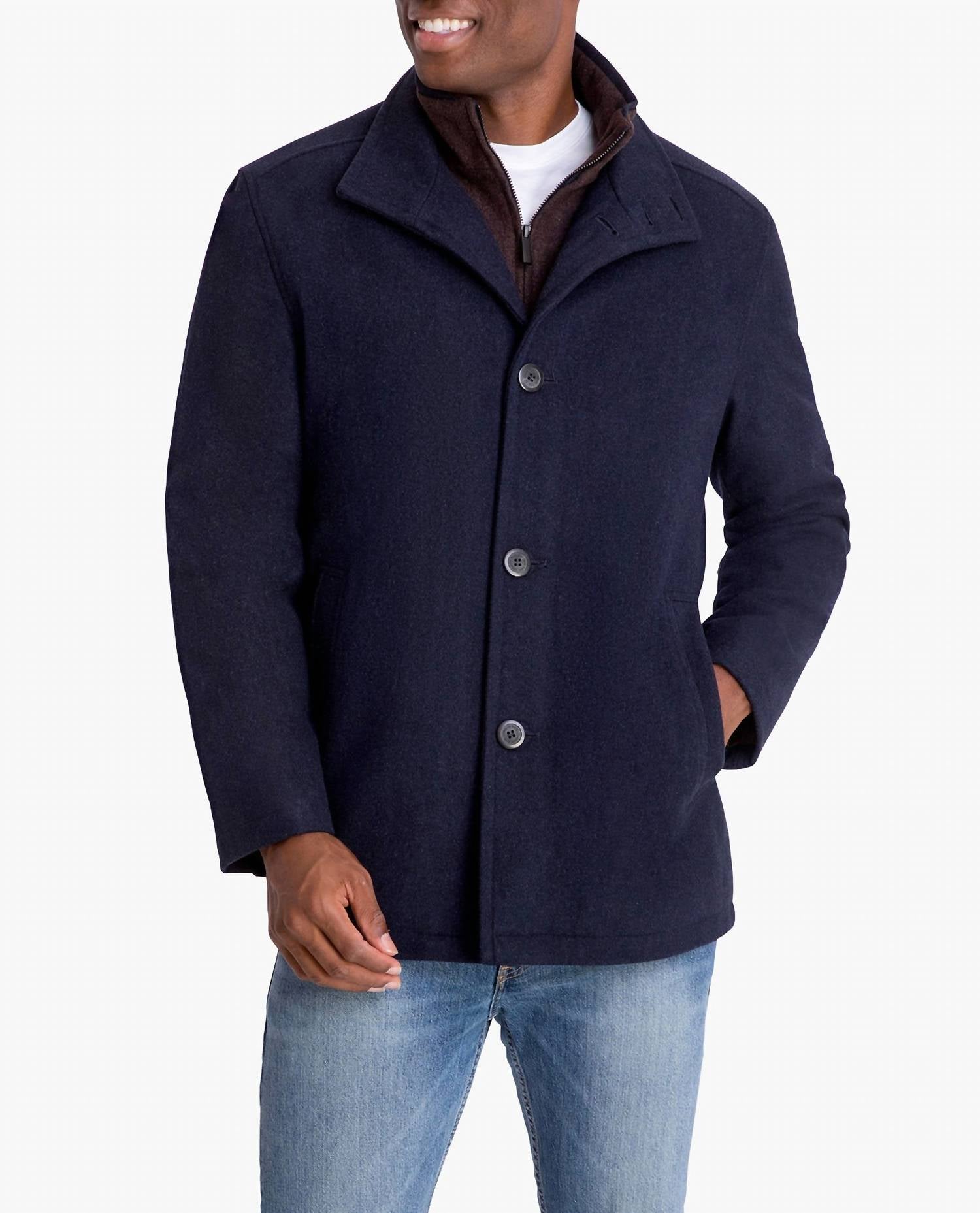 Explore the refined elegance of the Amherst Button Front Wool Jacket by London Fog, that adds sophistication to any ensemble. This men's jacket boasts long sleeves and is crafted from a 60% wool and 40% Melton blend, offering both warmth and durability. It features a unique double closure with both zipper and button options, complemented by a button closure stand/funnel collar for added style. Tailored for a true-to-size fit, it includes two practical front pockets and is lined for comfort, perfect for your travel occasions. Care: Dry clean only. Dimensions: Inseam 31.5" (M), Sleeve length 35.75" from center back.