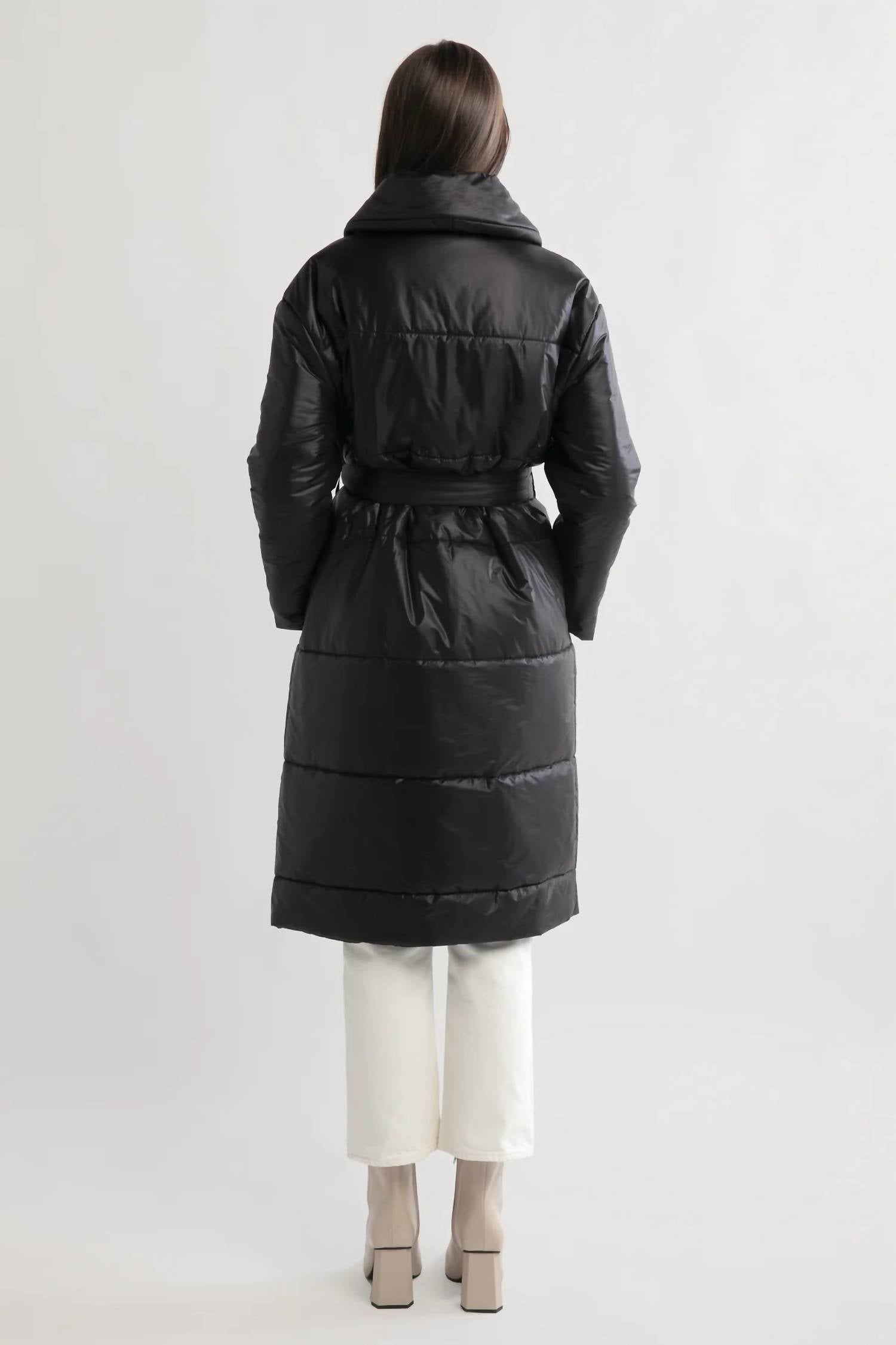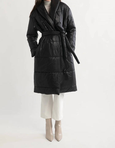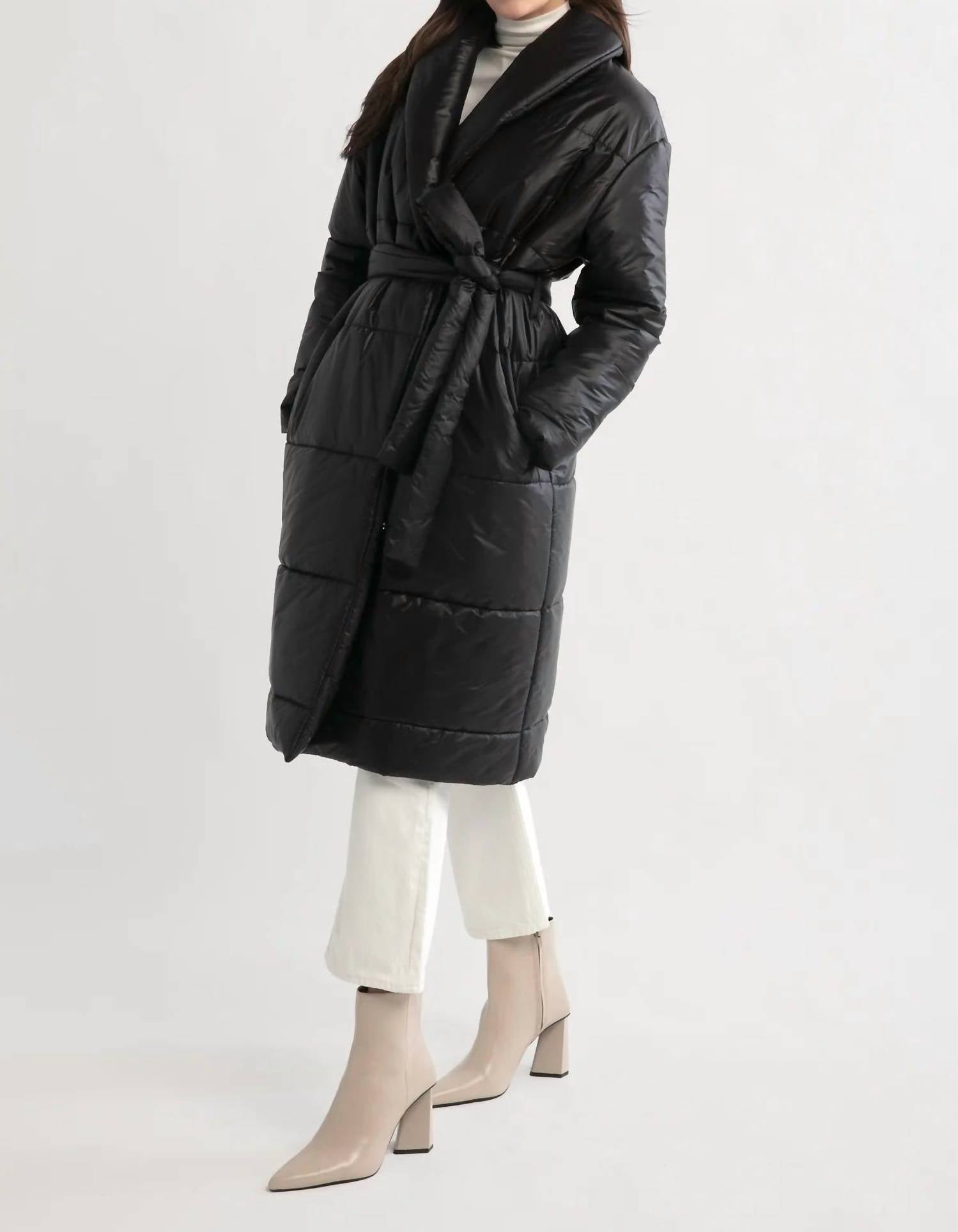 Step out in style with the Glassy Long Puffer Coat by Look By M, a chic addition to any wardrobe. This coat, tailored for women, offers long sleeves, a wide shawl collar, and a flattering waist tie closure. Crafted from 100% Nylon and featuring side pockets, its black solid color adds a versatile touch to your outerwear collection. Measuring a bust of 25.2 inches and a total length of 44.1 inches, it fits US sizes 0-10 comfortably. Care for it with a gentle hand wash and lay flat to dry. Model is 5'10.5" wearing a US 2.