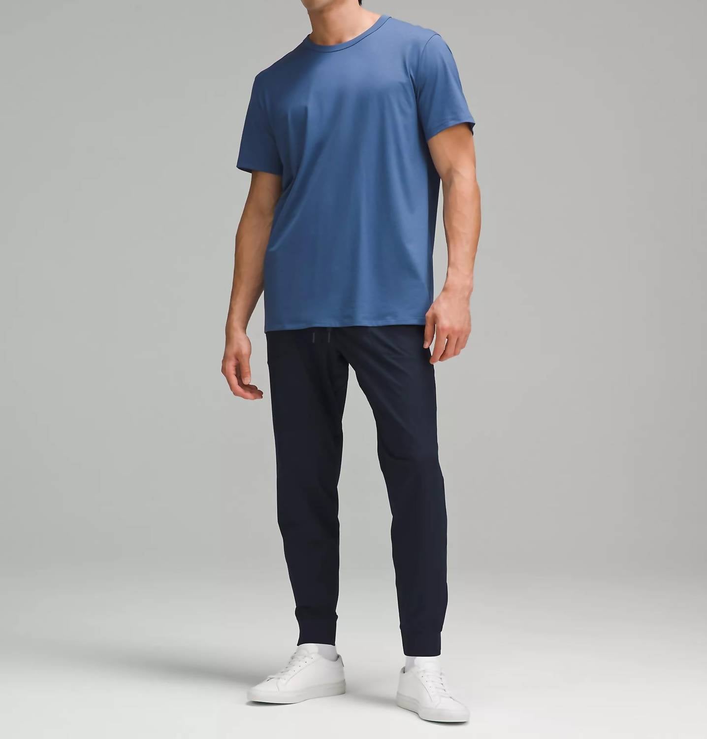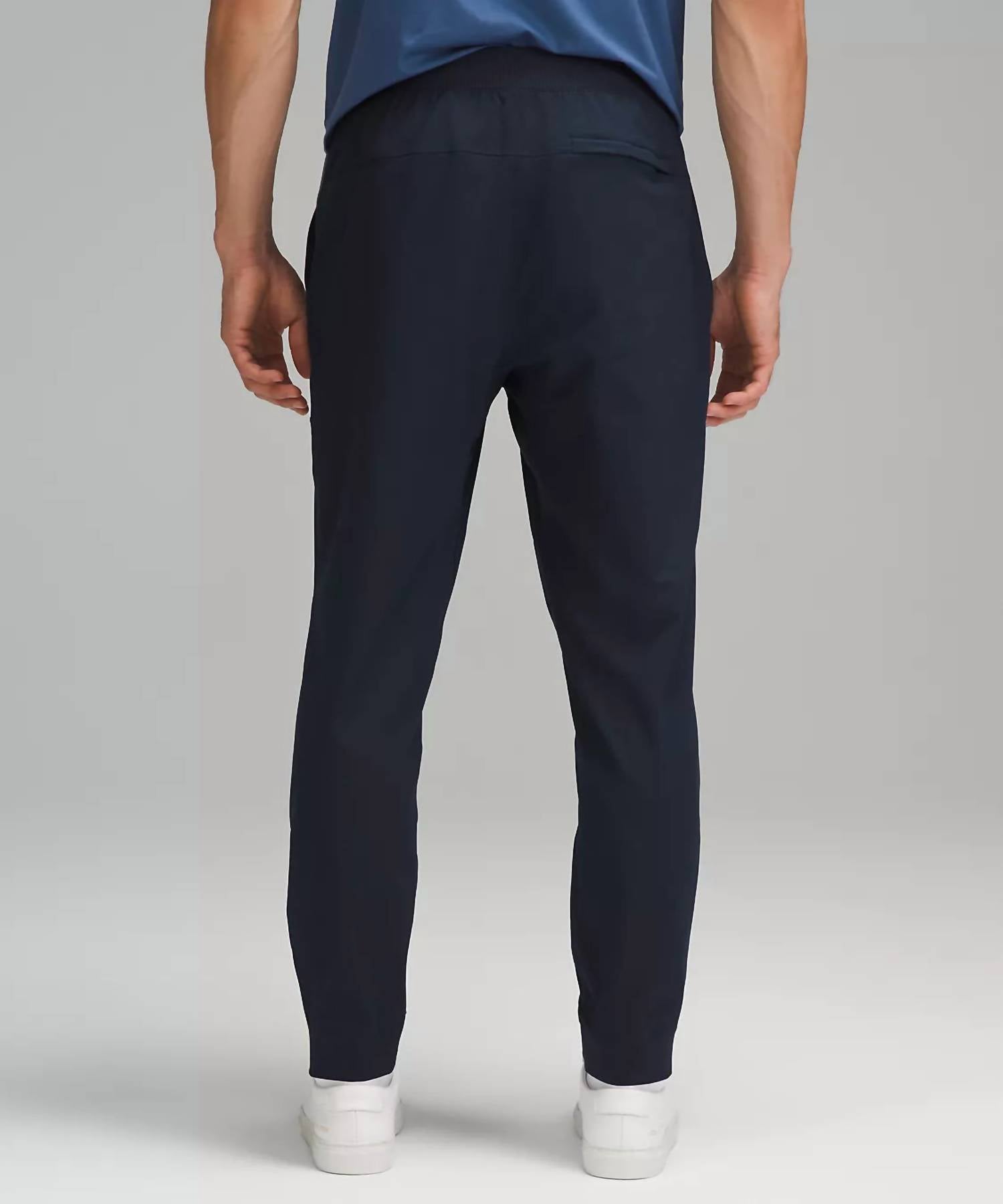 Elevate your casual wear with the Lululemon Men's ABC Warpstreme Jogger, an ideal choice for comfort and style. These true navy joggers feature a solid pattern in a relaxed fit with a tapered leg and mid-rise waist, perfect for a streetwear look. Crafted from 52% recycled polyester and 48% elastomultiester for four-way stretch, they incorporate signature ABC technology for enhanced movement. Equipped with a discreet zippered back pocket, these pants are pull-on for convenience. Care is simple with machine wash cold and tumble dry low, keeping you looking polished whether for 4th of July travels or everyday adventures.