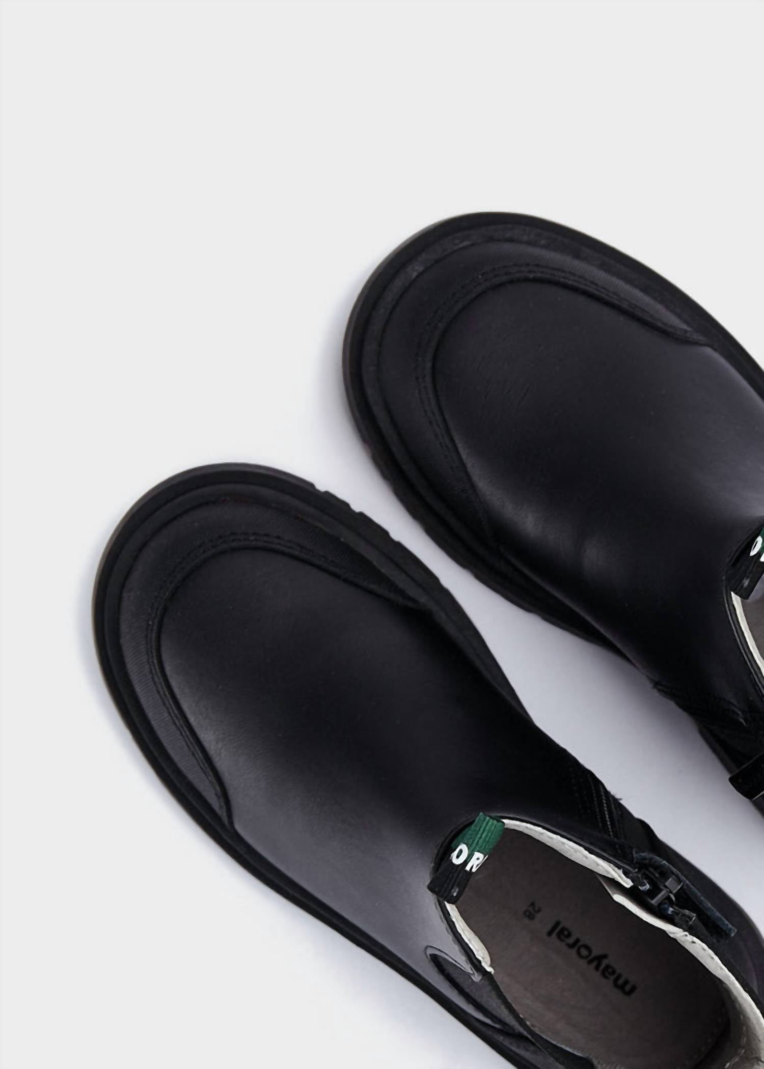 Introducing the Kid's Leather Chelsea Biker Boot Mid by Mayoral, perfect for a summer of streetwear style. These boots are made from sustainable leather and feature a durable rubber sole designed to withstand the seasons. They come with a convenient side zip closure and have a medium shoe width with a flat heel under 1 inch, making them comfortable for big kids. The classic round toe adds to the sleek, black design, ideal for any homecoming occasion.