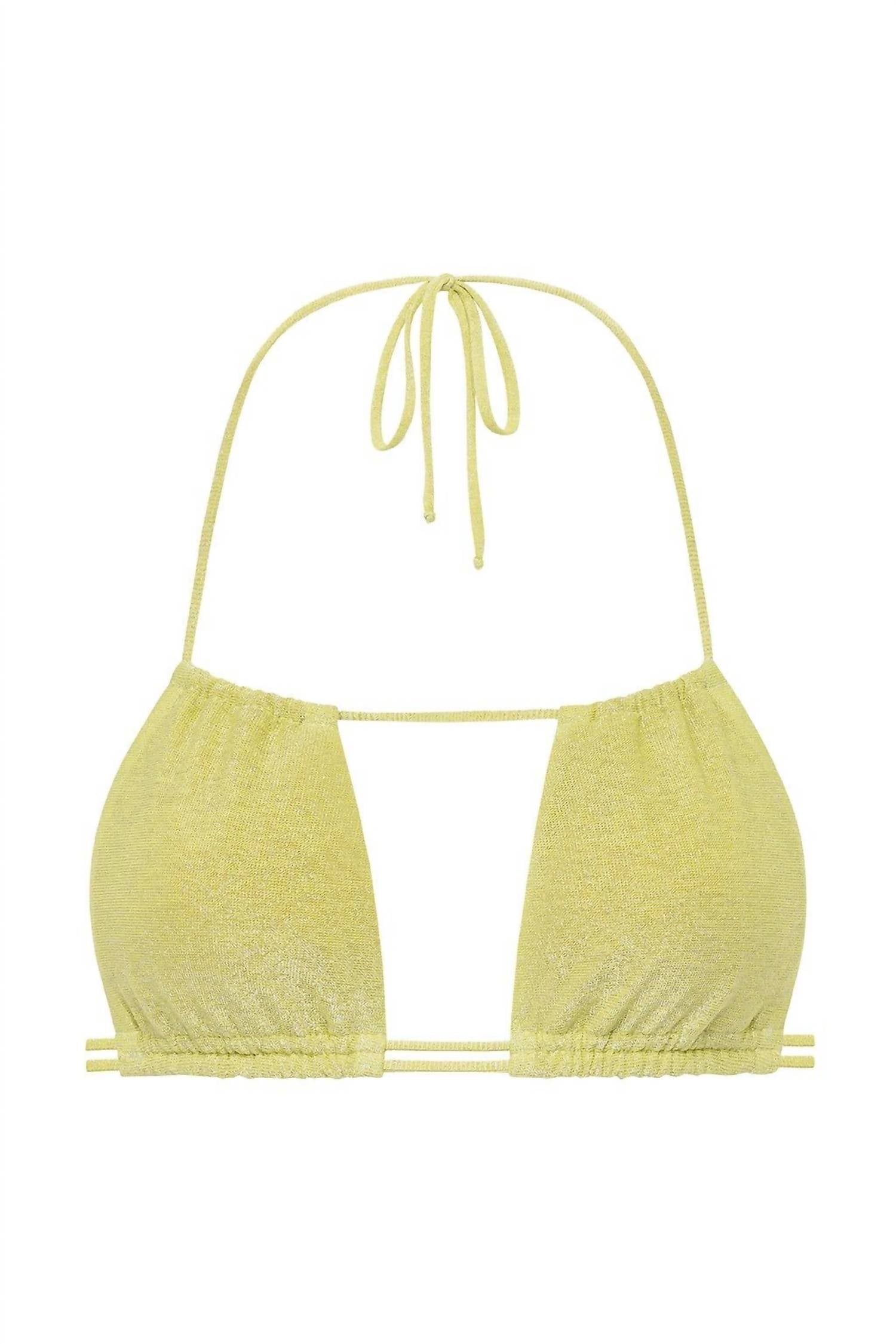 Elevate your summer wardrobe with the Brasil Halter Bikini Top by Montce in a dazzling Limon Sparkle. This women's swim top offers light support and features a flattering scoop neckline complemented by a keyhole cut-out in the center. Its fully adjustable design includes ties at the neck and back, along with sliding cups for a personalized fit. Ideal for a boho chic beach day, it boasts medium coverage and should be hand washed to maintain its vibrant hue.