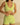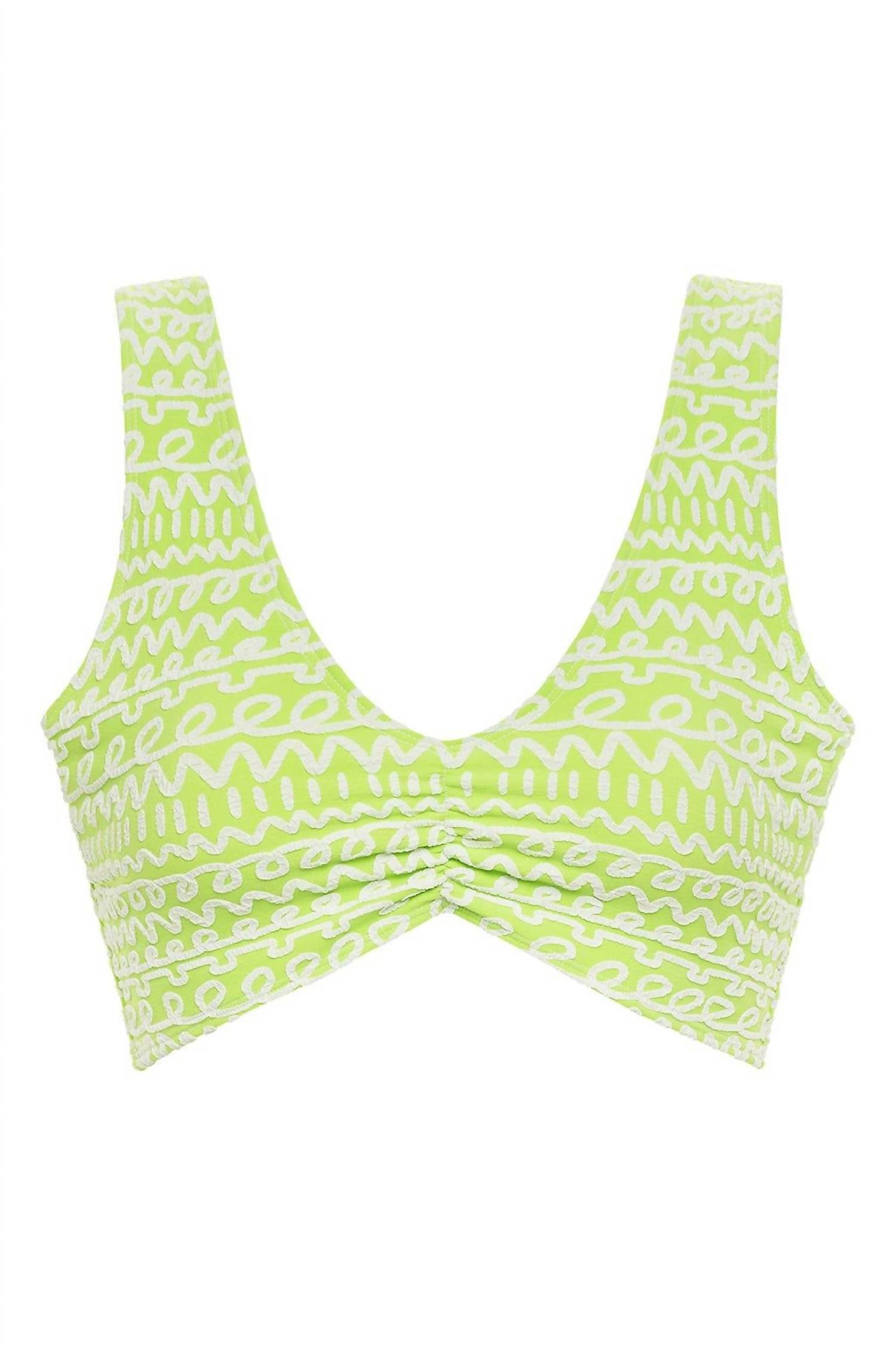 Introducing the Montce Kim Variation Top in vibrant Lime Icing, a chic and versatile swim top perfect for summer adventures. This medium support piece features wide straps for added comfort and a flattering V-neckline with ruched detailing in the front. Crafted from recycled materials and OEKO-TEX certified, this bandeau-style top is both environmentally conscious and fashion-forward. This patterned top, which runs large, functions as both swimwear and apparel, giving you a seamless transition from the beach to athleisure looks. Care: Hand wash, tumble dry.