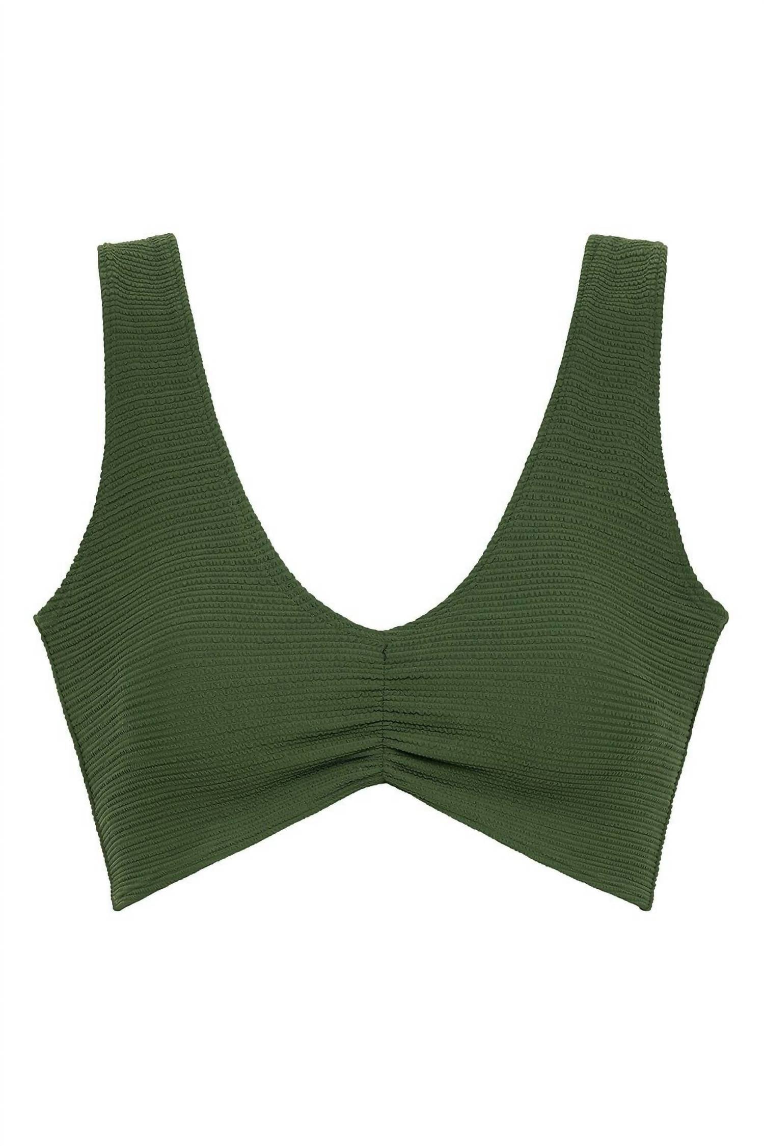 Introducing the Montce Micro Scrunch Kim Variation Bikini Top, perfect for sunny beach days in a stunning dark olive hue. Designed with wide straps and a flattering V-neckline, this pullover top offers medium support and features ruched detailing for a stylish touch. The nylon/spandex blend creates an extra stretchy, textured micro scrunch material that molds beautifully to the body. Fabric is imported from Spain, and for best care, hand wash and line dry this chic minimalist piece.