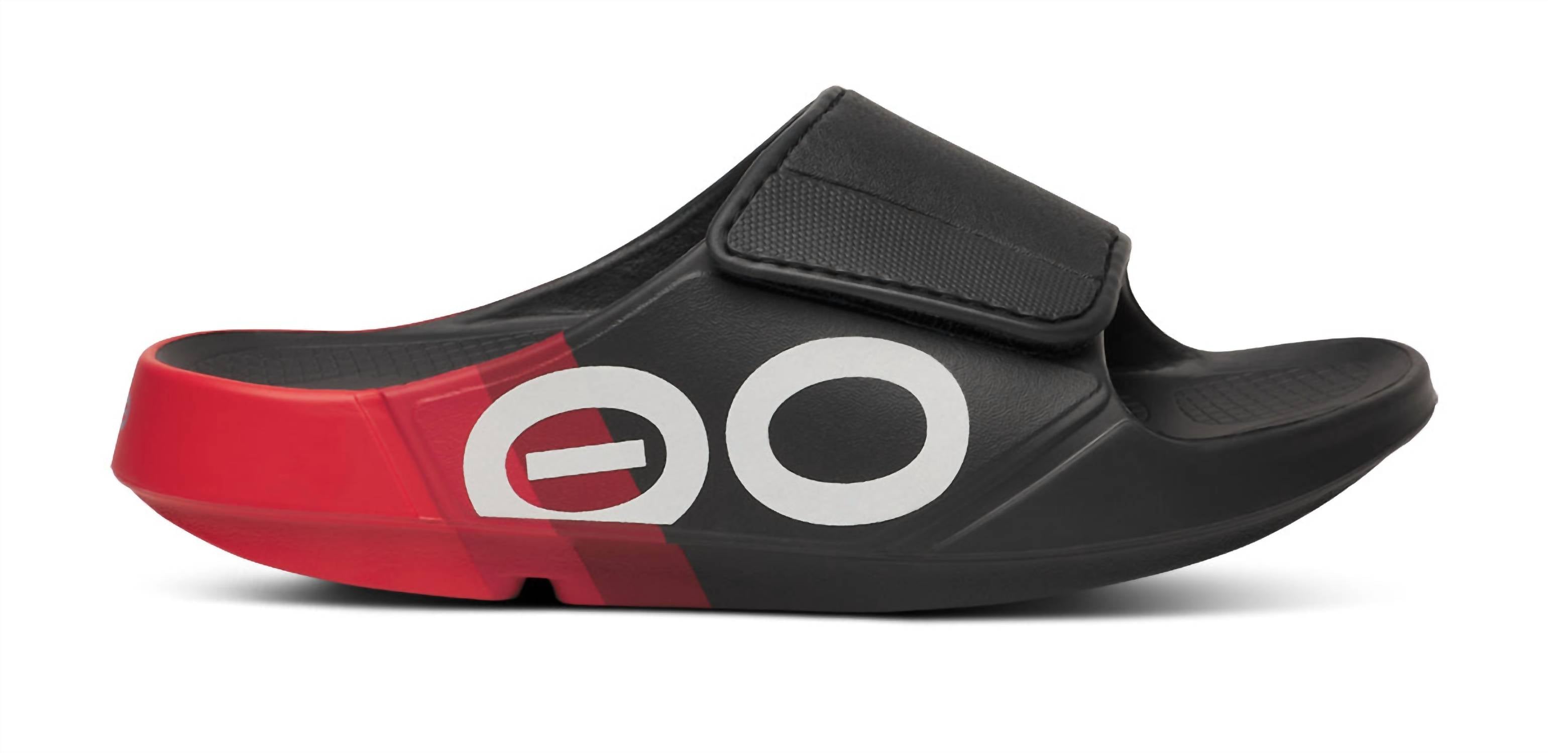 Experience ultimate comfort with the Men's Ooahh Sport Flex Limited Sandals by OOFOS in Fire Rally, a vibrant addition to your summer wardrobe. These sandals feature an agile OOfoam™ adjustable upper strap for enhanced support and a contemporary fit. The round toe design and flat heel embody an athleisure aesthetic, perfect for game day outings. Ideal for men seeking a stylish and comfortable footwear choice, these sandals promise a modern spin on the classic slide.