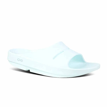 The 1100-ICE OOFOS Women OOAHH Slides are made from OOfoam, which absorbs 37% more shock than other materials, providing impact absorption and arch support. They are designed for after-sport use and everyday wear, reducing stress on feet, knees, and lower back. The slides conform to your feet for natural motion and are lightweight due to minimalist construction. They are moisture-resistant, odor-resistant, and machine washable, making them suitable for shower and beach use. The slides are durable, maintain their cushioning, and are so light they can float. Cop