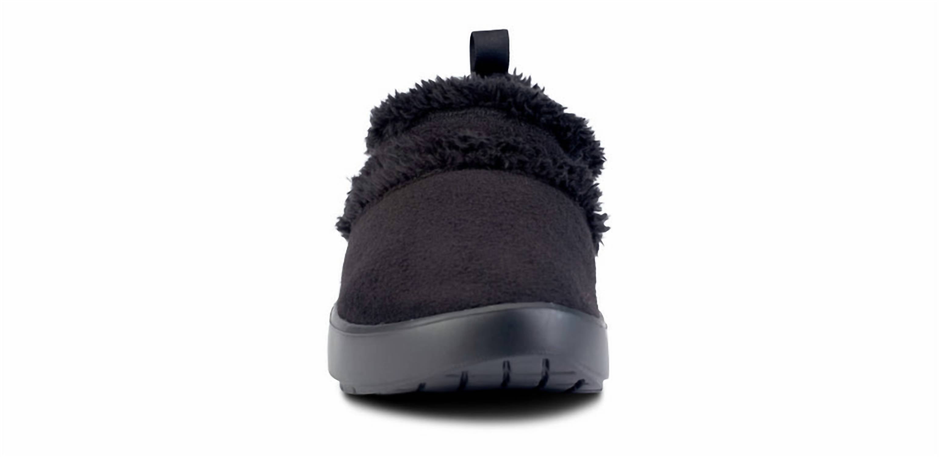 Experience unmatched comfort with the Women's OOcoozie Low Shoe in Black by OOFOS. Designed for women, this sneaker features a warm, vegan sherpa upper that is recyclable and machine washable. Enjoy OOFOS' proprietary OOfoam™ technology, which absorbs 37% more impact than traditional footwear foams, reducing stress on your feet and joints. With a medium width and round toe shape, it's perfect for indoor lounging and quick errands.