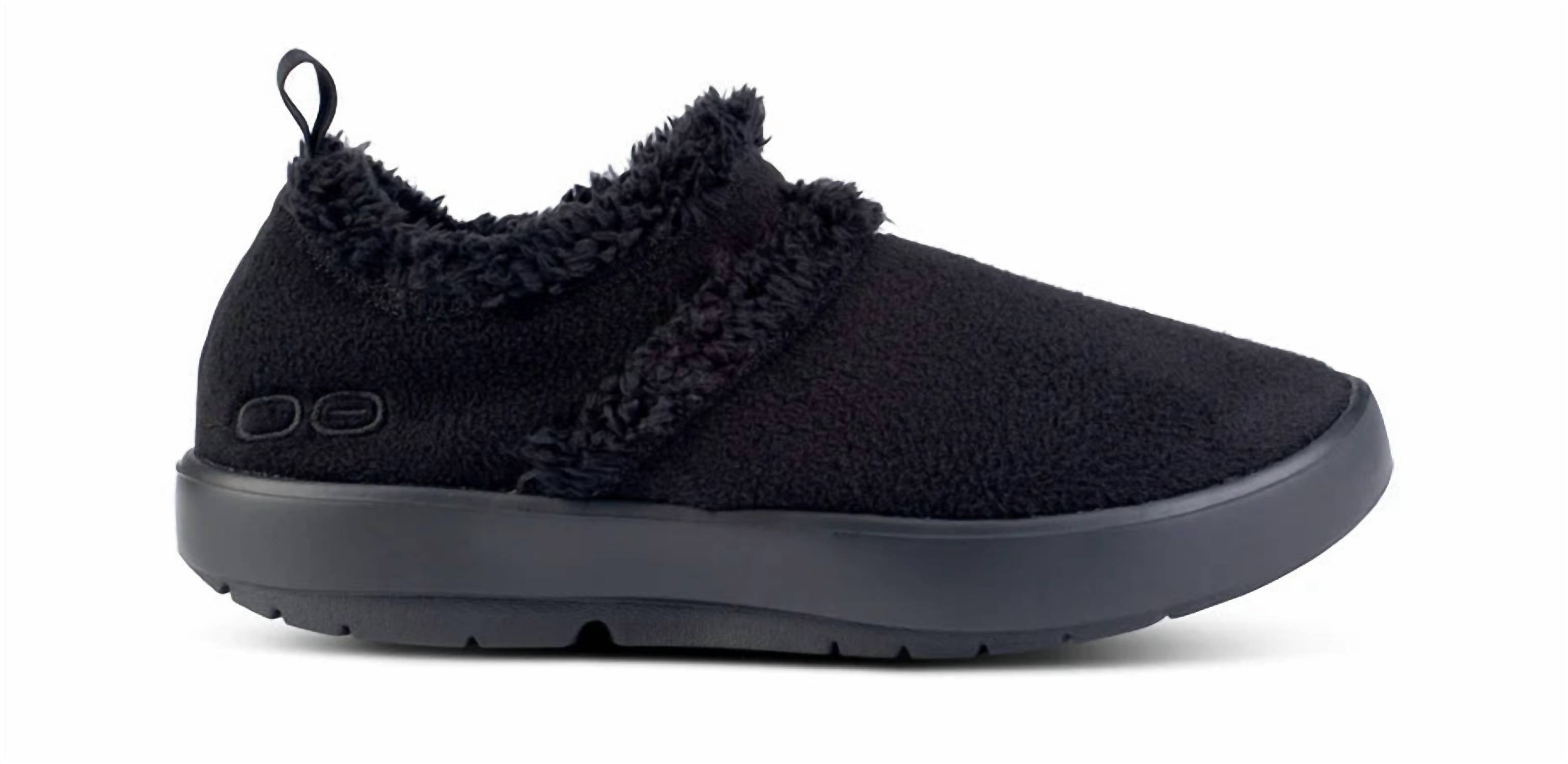 Get your daily steps in with these adorable sneakers. Slip into comfort with the Women's Oocoozie Low Shoes by OOFOS, now available in classic black. Featuring a mule style with an easy no-fuss slip-on design, these sneakers are crafted with warm, vegan sherpa material that's both recyclable and machine washable. The innovative OOfoam™ technology absorbs impact for active recovery, making them perfect for both indoor lounging and quick errands. Heel Height: Flat (1" & Under). Material: Rubber. Ideal for winter occasions like dinner parties, they offer a cozy embrace and minimalist style.