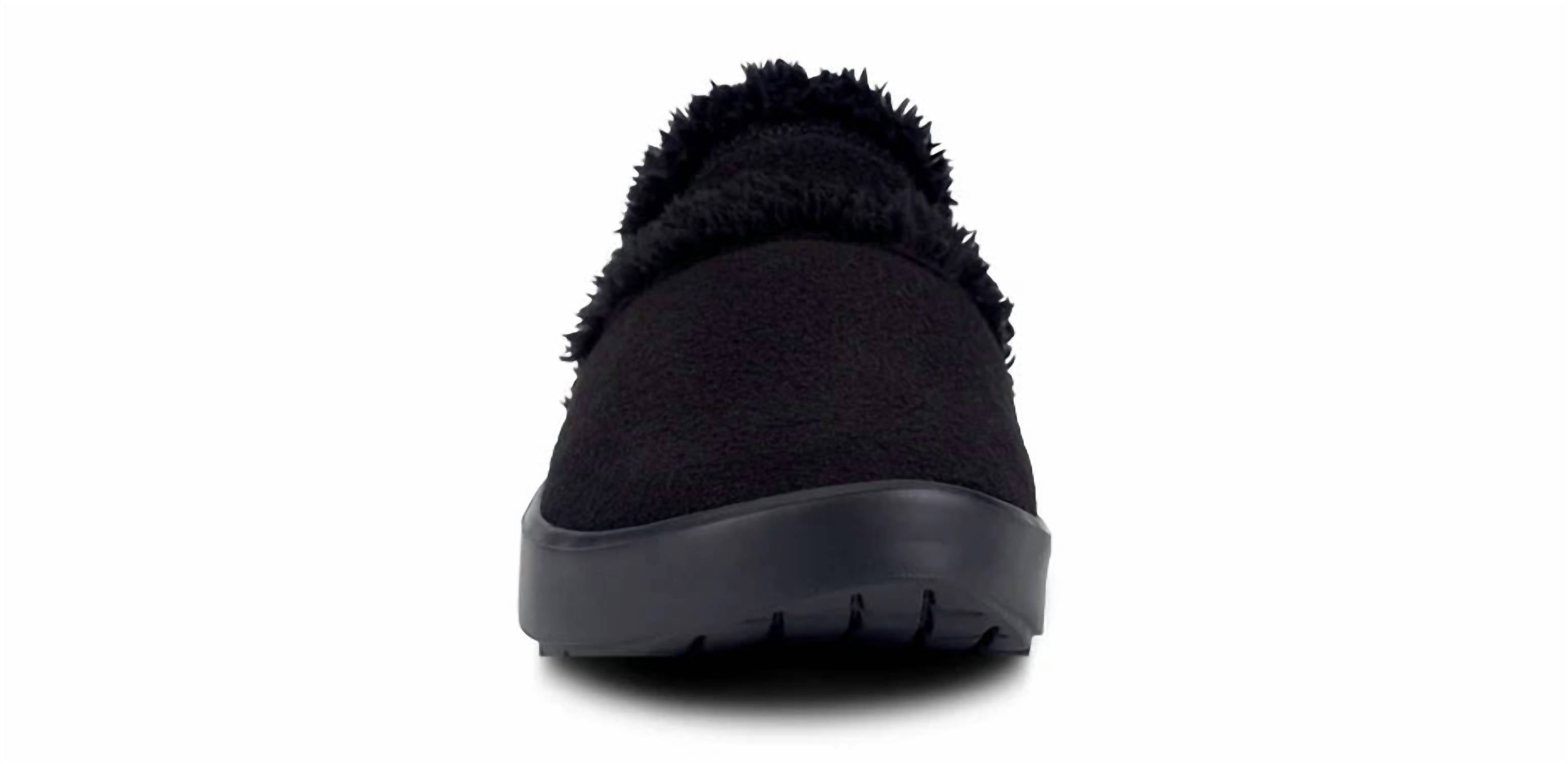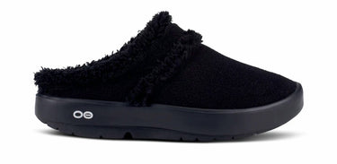 A trend that everyone is loving and this style might just be our favorite. Step into comfort with the Women's Oocoozie Mule Shoes by OOFOS, designed for both style and functionality. These black mules feature a no-fuss slip-on design with a round toe and cozy vegan sherpa material, ensuring warmth and sustainability. Experience the unique OOfoam™ technology that absorbs impact, providing cushioning and active recovery for your feet. Ideal for a minimalist and versatile lifestyle, these shoes are perfect for indoor lounging or attending a dinner party.