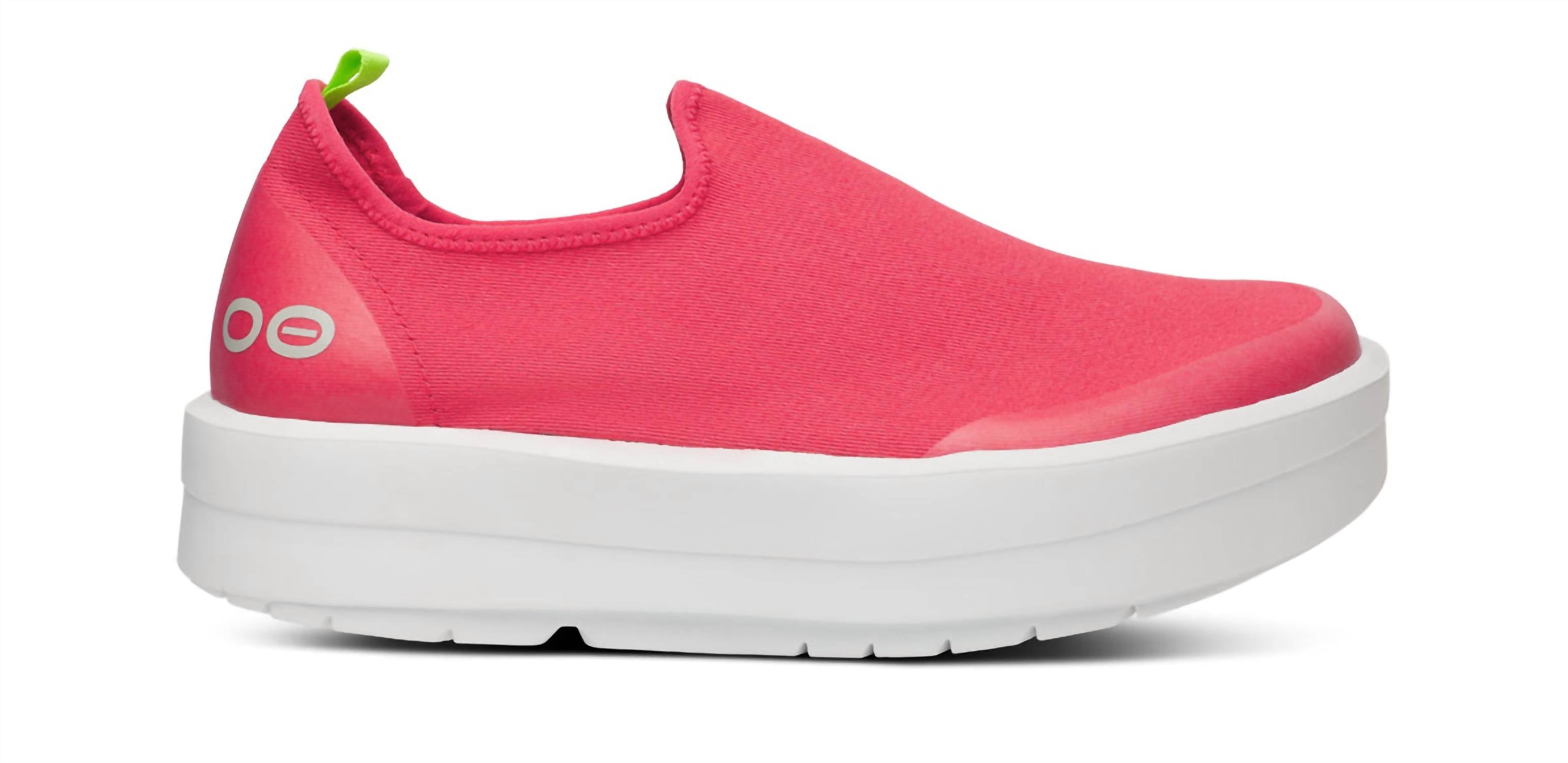 A trend that everyone is loving and this style might just be our favorite. The Women's Oomega Eezee Low Shoe by OOFOS revolutionizes active recovery with a modern twist in a vibrant Neon Berry color. Designed as a women's platform shoe featuring the trendy platform heel, it offers a round toe shape perfectly suited for summer travel and athleisure wear. The standout feature is its MEGA midsole, providing an additional 15mm of impact-absorbing OOfoam™ technology, ensuring comfort and style like never before. Embrace this trend-setting combination of innovation and fashion for an unparalleled recovery experience day or night.