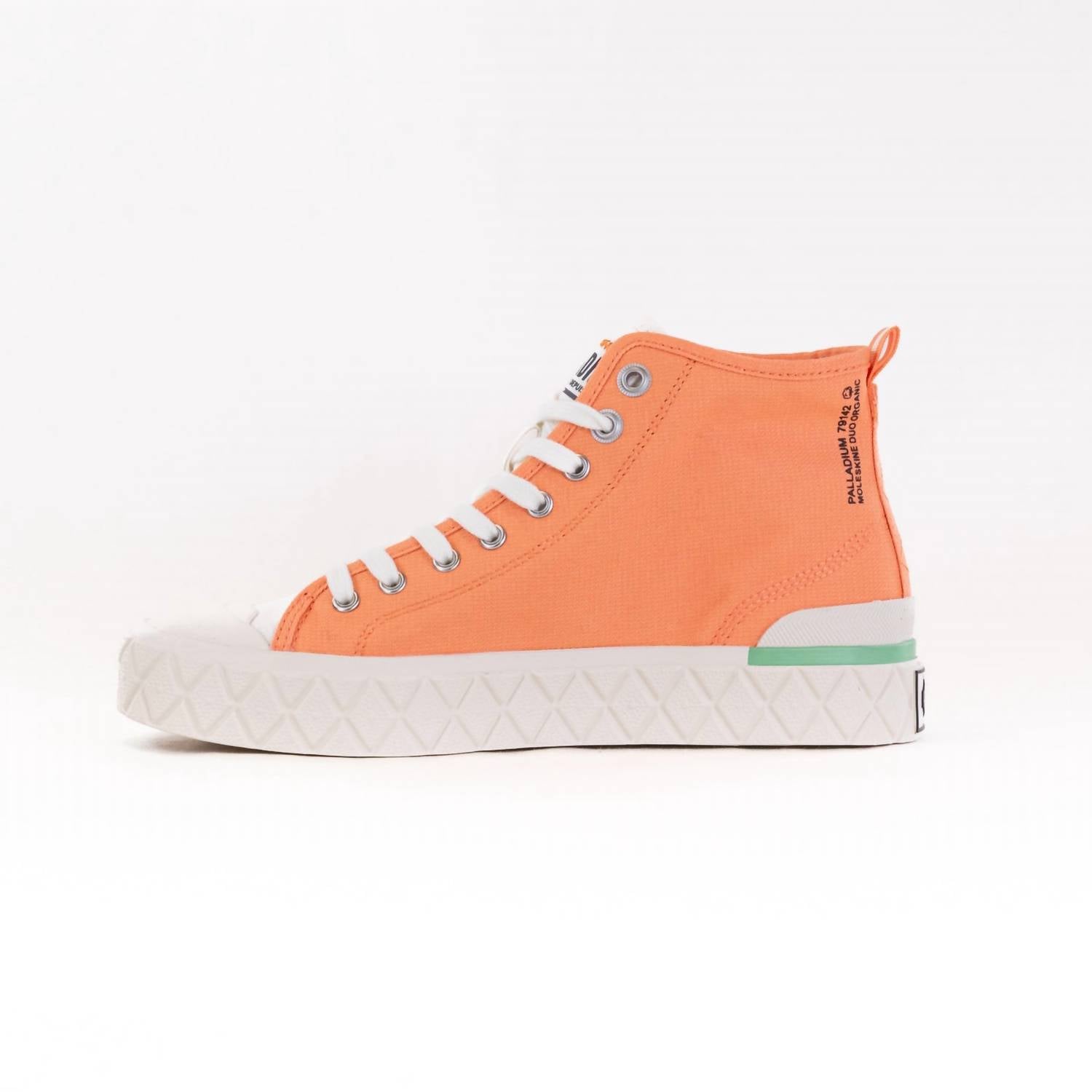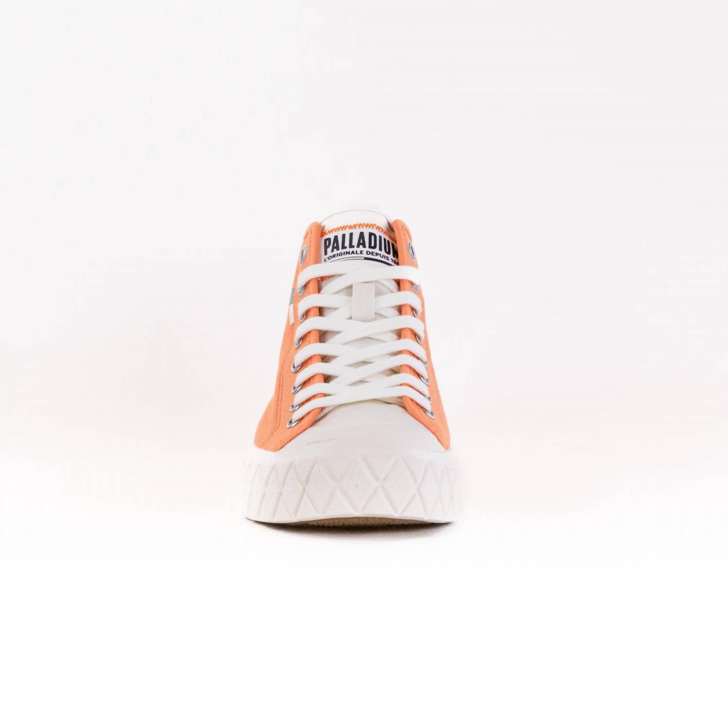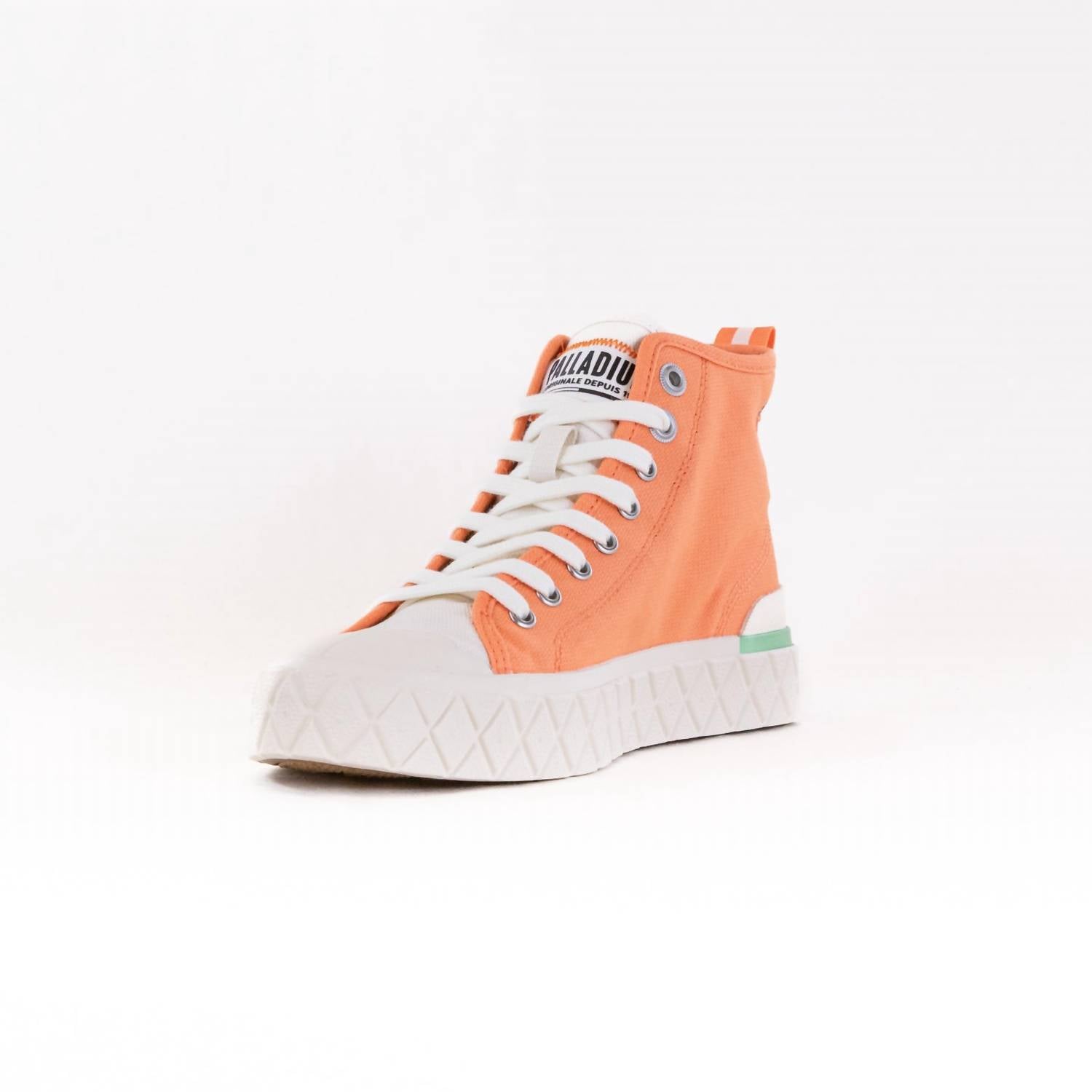 Discover the Women's Palla Ace Chukka Organic by Palladium, a mid-cut sneaker-boot hybrid in a vibrant Sunstone Orange. Crafted from 100% organic cotton with a textile lining and a soft cotton insock for maximum comfort, it features a durable rubber outsole and protective rubber toecap. Closure is achieved with flat laces and eyelets, complemented by stylish branding elements like a round rubber patch and screen print details. This shoe, designed for women with medium shoe width, offers a chic yet practical choice for spring days.