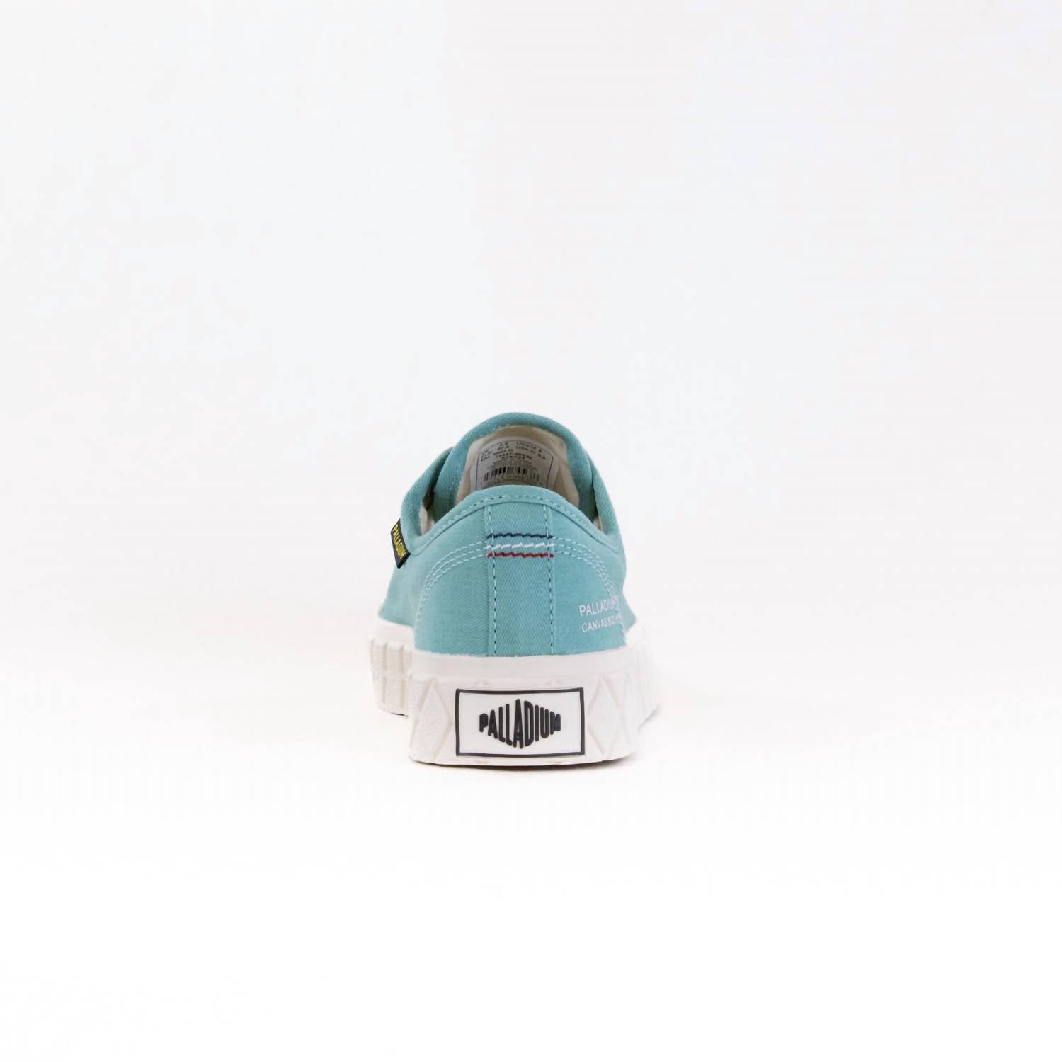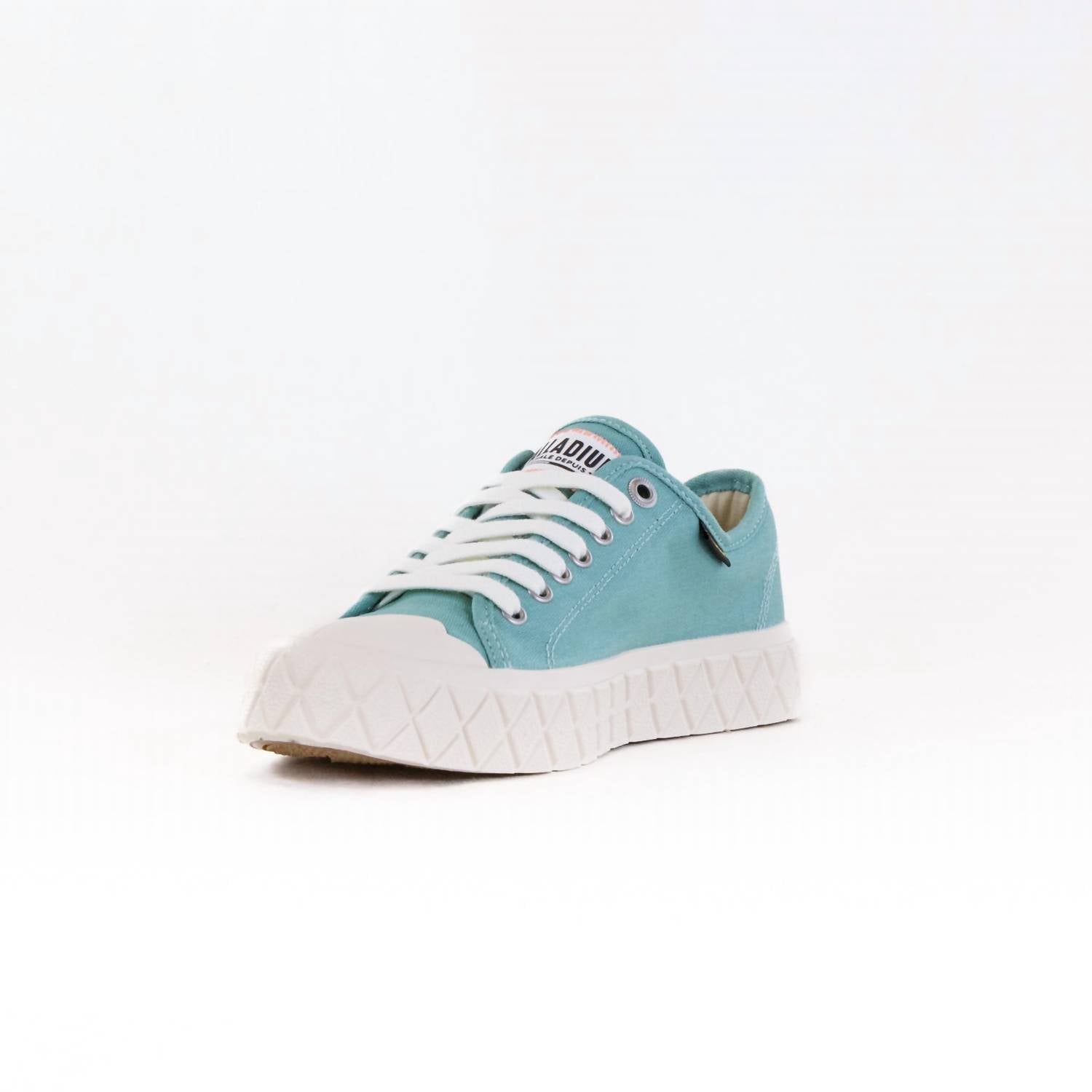 Introducing the Women's Palla Ace Cvs Organic Sneakers by Palladium, a perfect blend of tradition and modern values. These low-cut sneakers in an eye-catching sea green feature a 100% organic cotton upper and lining, ensuring both comfort and durability. The flat heel stands at 25mm, complemented by a protective rubber toecap and outsole for everyday ease. Stay stylish and environmentally conscious with a lace-up closure and unique branding elements including a side woven label and screen print accents.