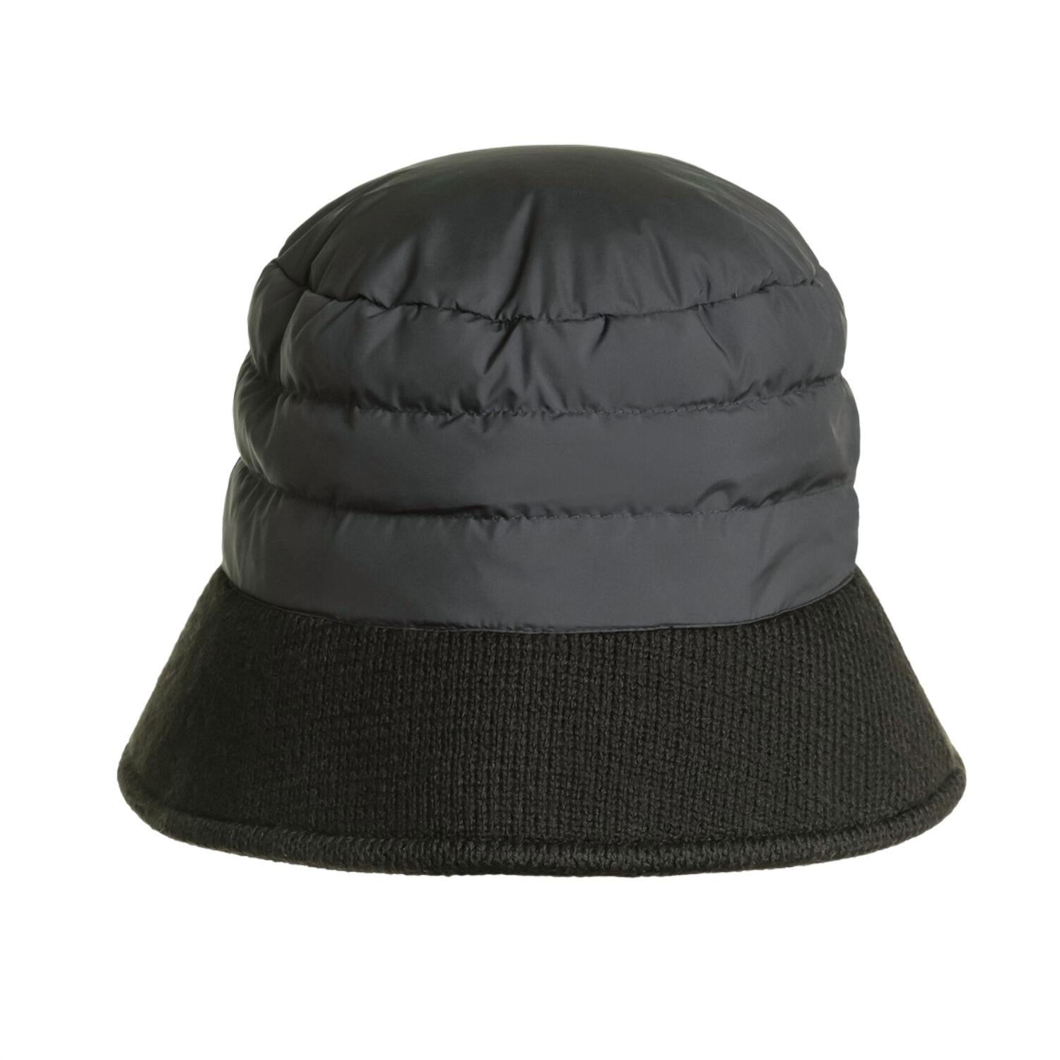 Bucket hat with patch on the front. Crafted in down proof, 100% polyester matte finish taffeta, with water repellent treatment, and a 7 GG moss stitch, 70% extra fine merino wool – 30% low pilling acrylic. Filling is 90% duck down . 10% duck feathers.
