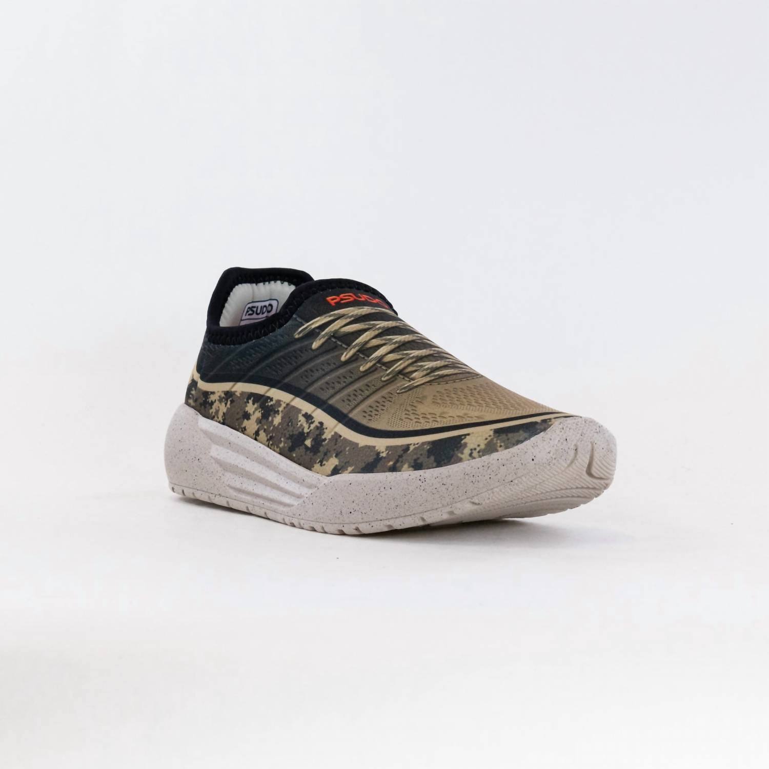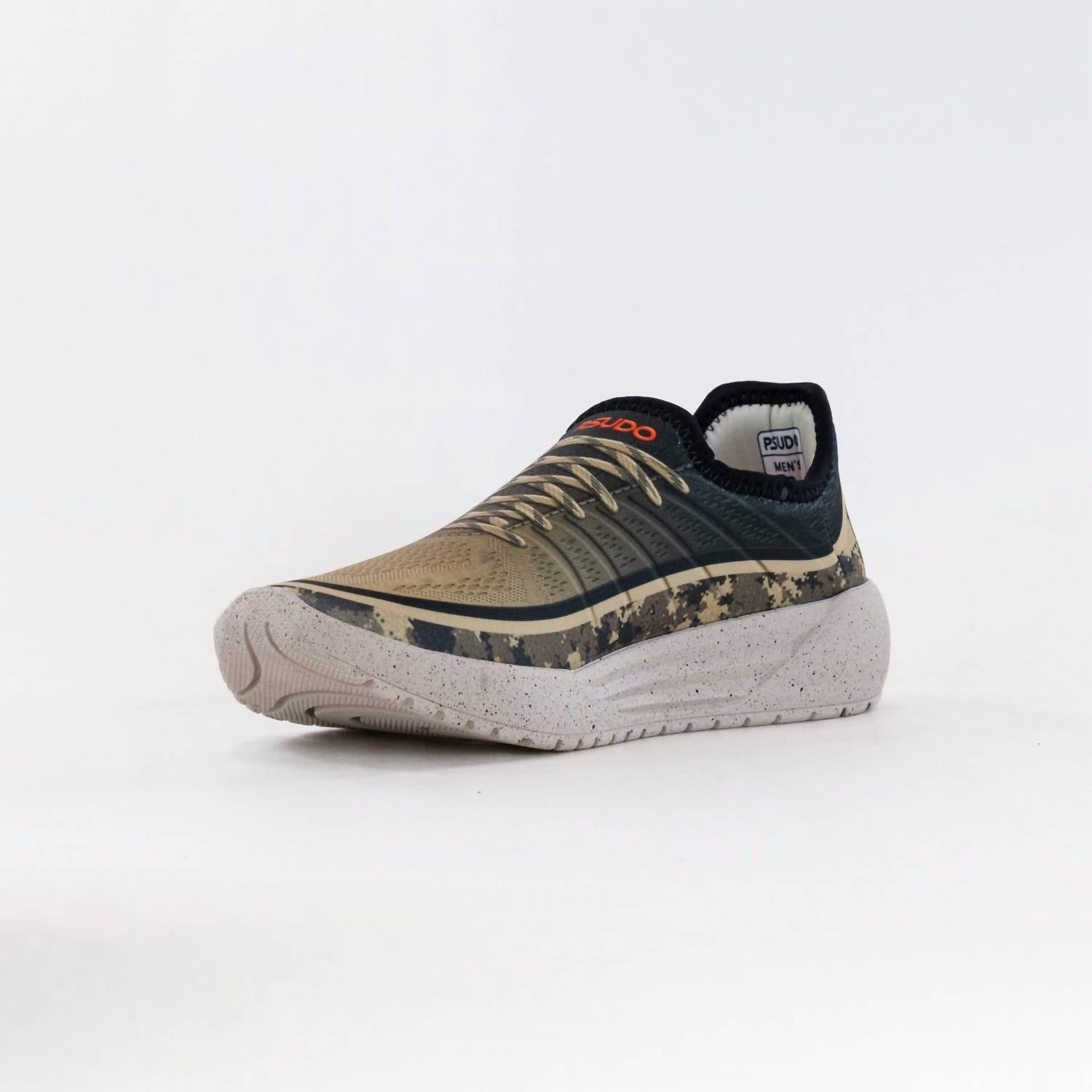 Elevate your athleisure wardrobe with the Men's Racer Sneaker from PSUDO, a stylish choice for fitness enthusiasts. This eco-friendly, slip-on sneaker features a breathable and sweat-wicking upper made of Repreve fabric, ensuring optimum comfort. Crafted in the USA, the sneaker supports the foot with anatomically correct arch support and an anti-microbial insole, suitable for wearing with or without socks. Care: Machine washable in cold water on a gentle cycle, remove insole to hand wash separately, and air dry. Available in a trendy taupe ombre/camo, this sneaker is perfect for the Easter season.