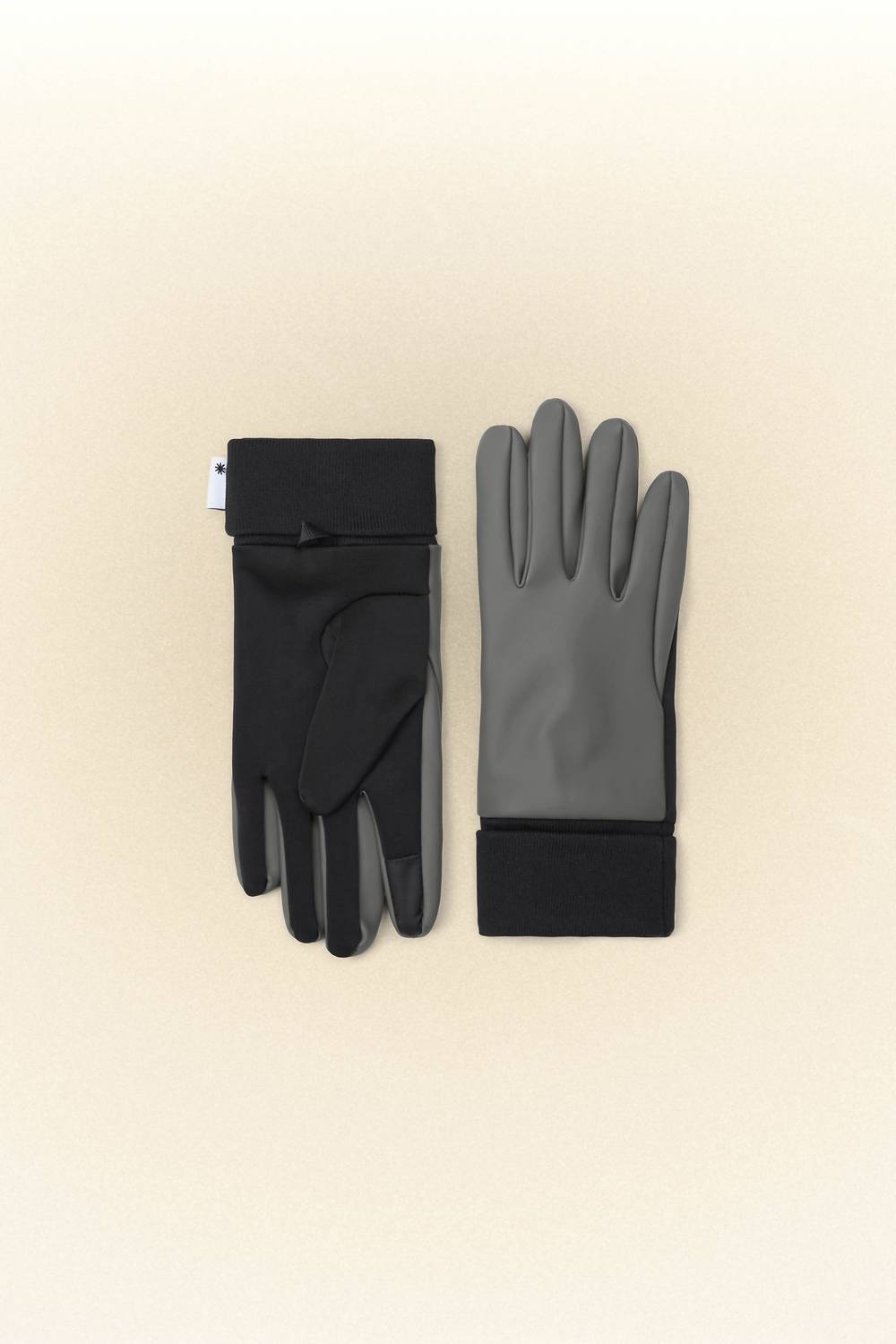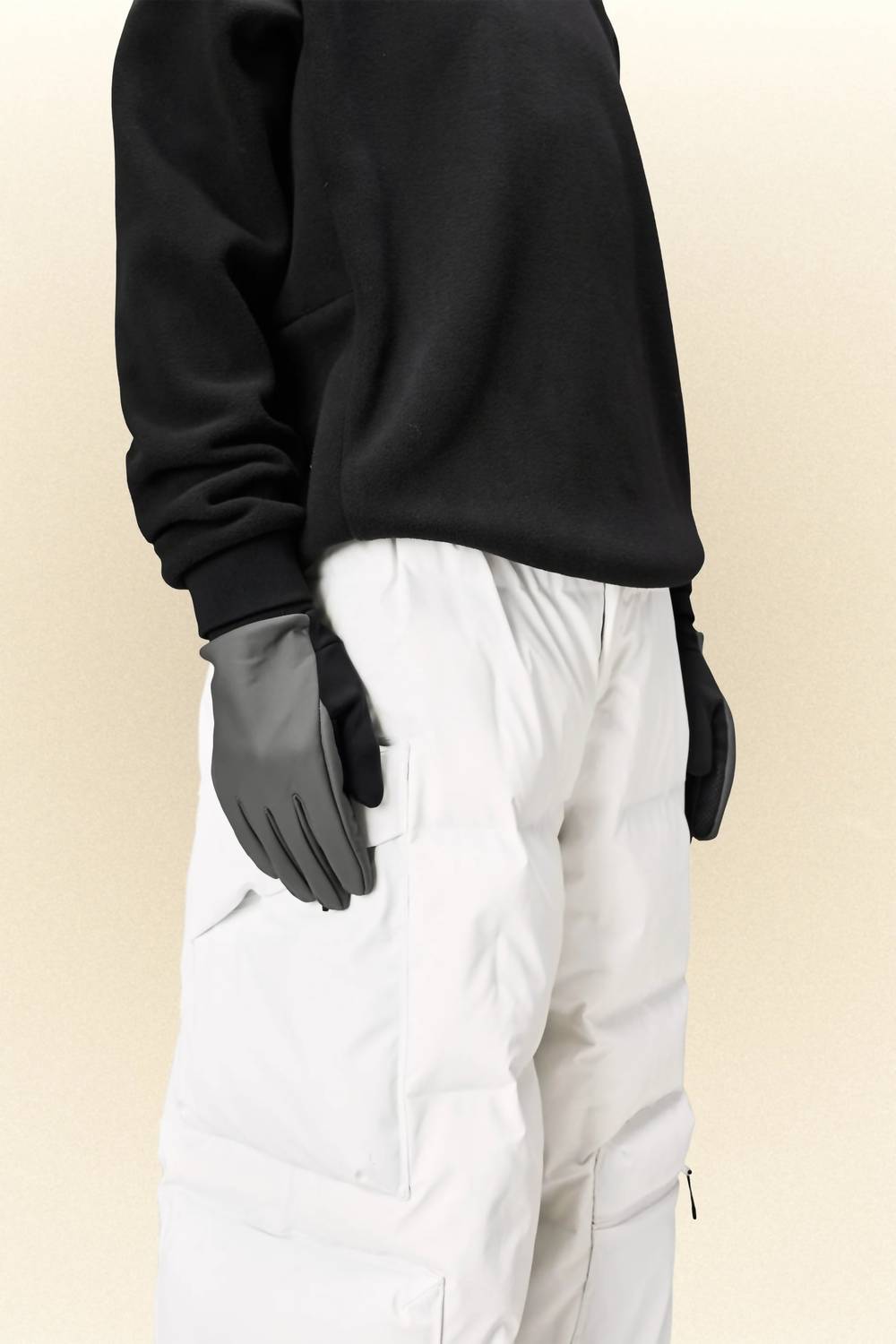 Introducing the Rains Insulated Gloves, designed to keep your hands warm and comfortable in colder climates. These gloves feature a fleece lining with backs in signature waterproof fabric and neoprene palms for everyday protection against light moisture. With ribbed cuffs that can be unfolded for extra windproofing, and touchscreen-compatible thumb and forefinger tips, they are both functional and versatile. Composition: Upper is 100% polyester with polyurethane coating, palm and cuffs are 100% polyester. Measurements in size small: 19 cm hand length, 8.5 cm hand width; in size medium: 20 cm hand length, 9 cm hand width; in size large: 21 cm hand length, 9.5 cm hand width.
