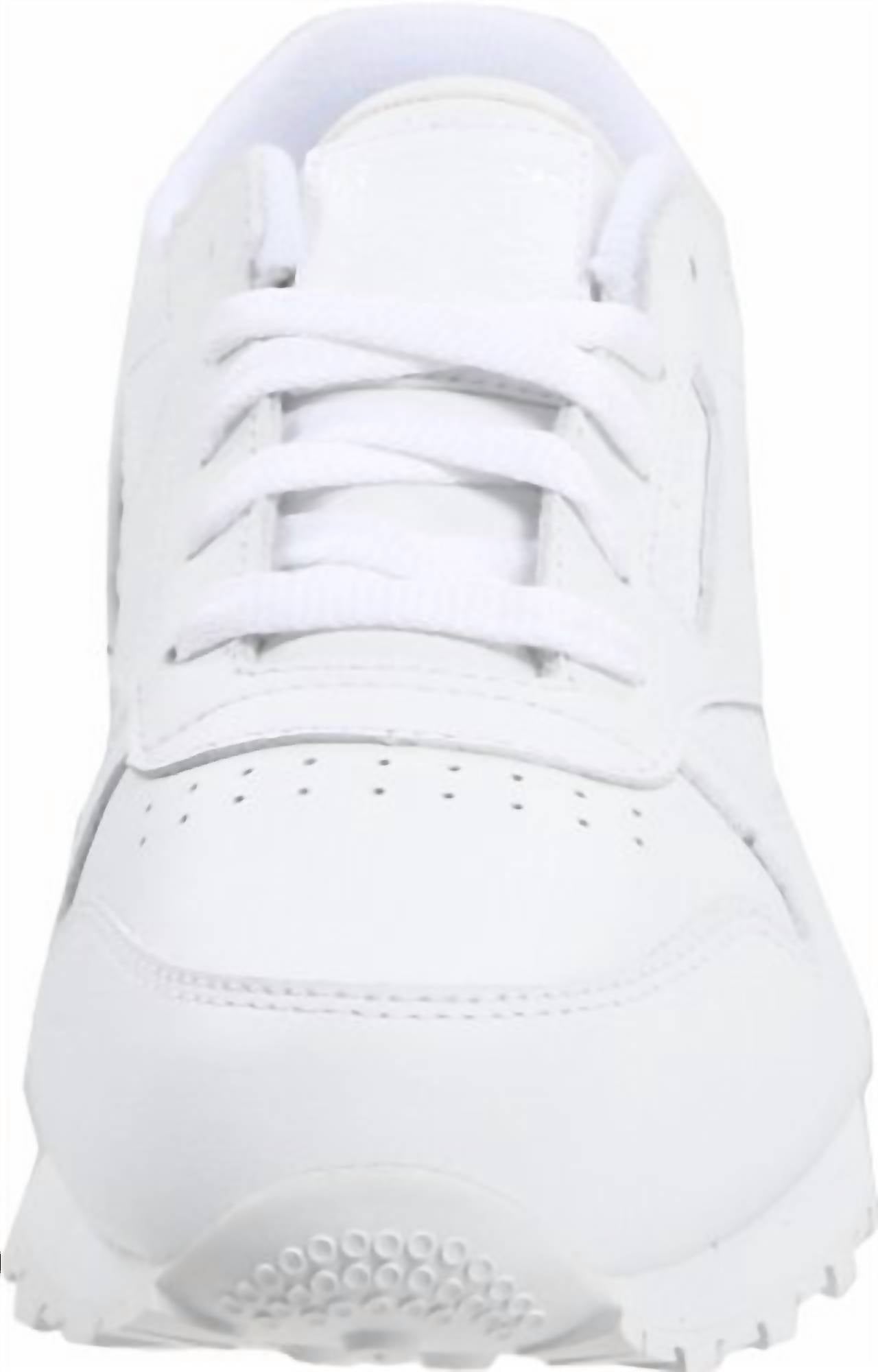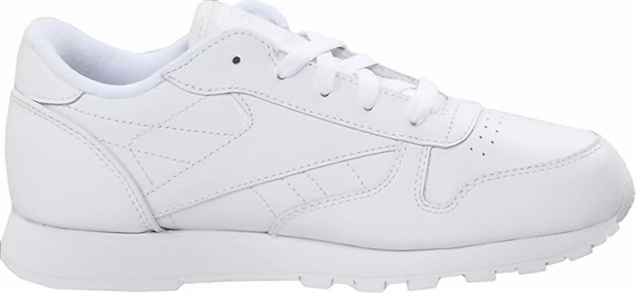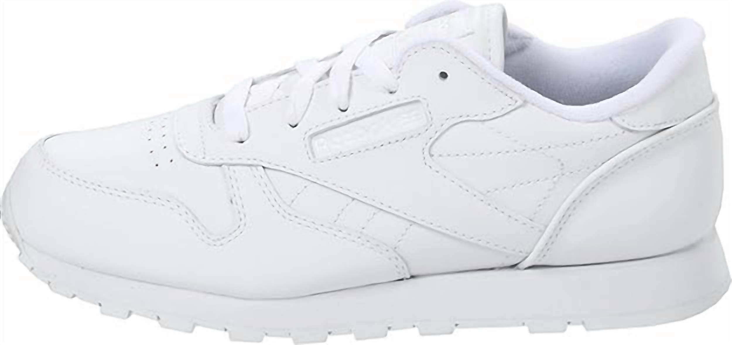 Introducing the Infants Classic Leather Sneaker by Reebok, crafted for the comfort of your little one. These sneakers boast a soft leather upper and a die-cut EVA midsole that provides lightweight cushioning. Made for durability, the shoe features a high-abrasion rubber outsole. The design is completed with a round toe shape in a crisp white hue, suitable for toddler boys.