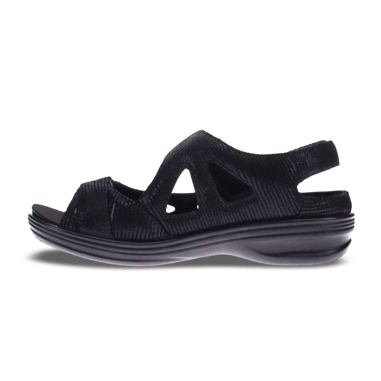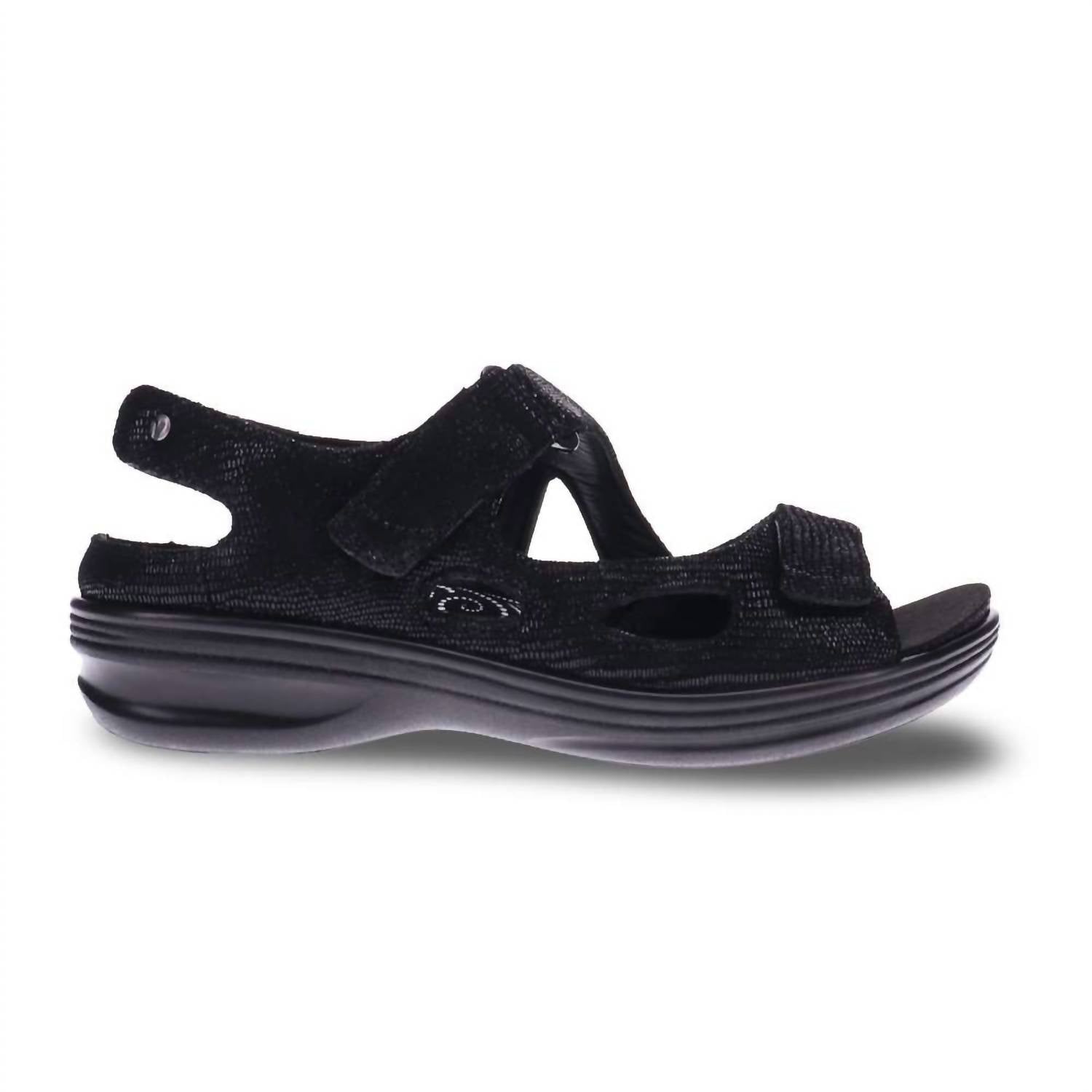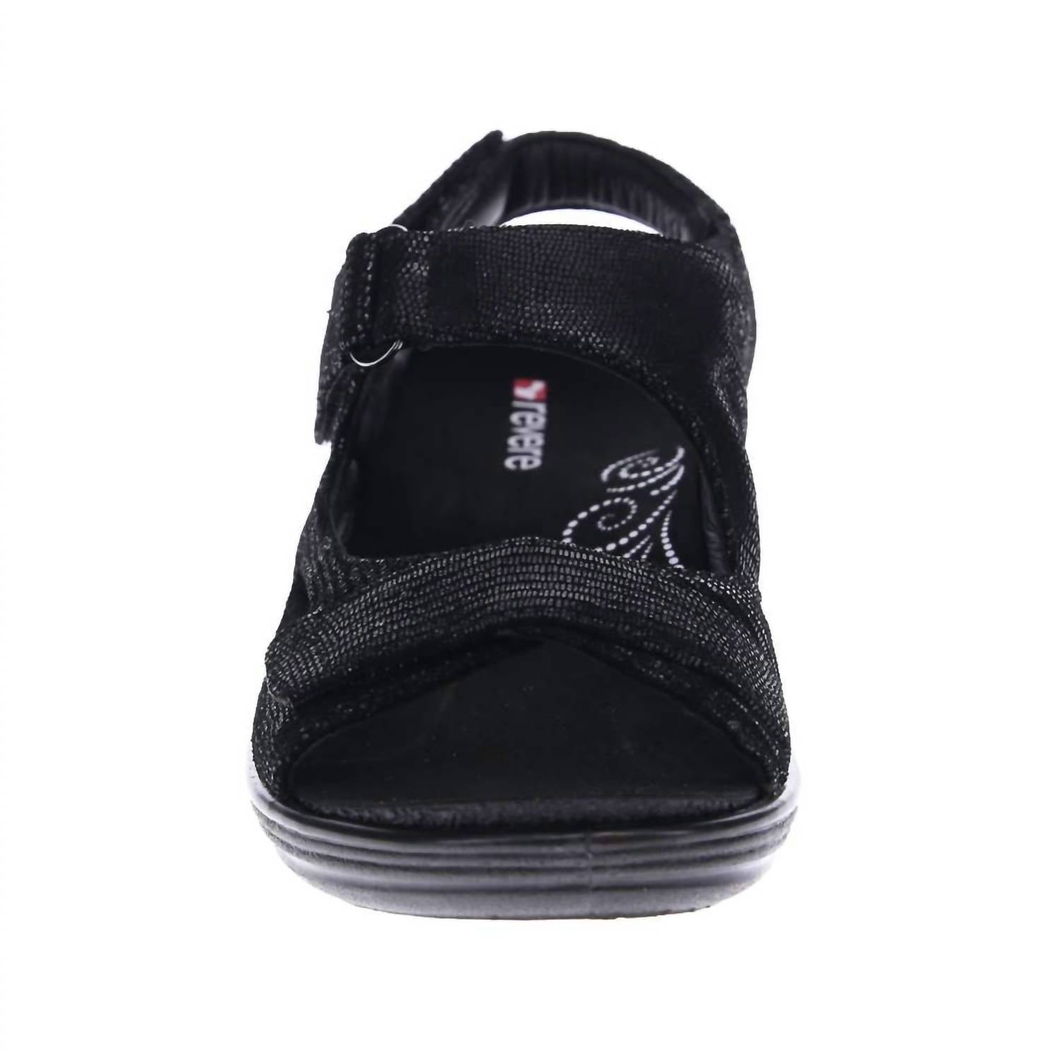 Elevate your summer travels with the Women's Astoria Adjustable Strap Sandal by Revere, crafted in a stylish Black Lizard design. Featuring a microfibre comfort insert treated with anti-microbial properties, these sandals promote optimal foot health while minimizing odor. The orthotic-friendly design includes a removable deep comfort insert and additional depth to accommodate custom orthotics, with adjustable uppers ensuring a perfect fit. Slip-resistant outsole provides secure footing, and included matching strap extensions offer personalized styling options. To clean, simply wipe with a damp cloth and air dry under indirect sunlight to maintain their integrity. Recommended for whole sizes 5-11; if between sizes, order the next size up. Heel height is a comfortable low wedge (1 1/4"-2") with a round toe shape.