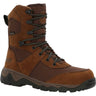 Features a waterproof full-grain leather upper combined with 900 denier Cordura® for durability. The lightweight and flexible molded EVA midsole ensures comfort, while 400 grams of 3M™ Thinsulate™ Ultra Insulation provide warmth. It includes Rocky® Waterproof construction and a light, flexible cement construction for added durability. The Terra Suspension Footbed offers support and cushioning, and a fiberglass shank enhances stability. The rubber outsole provides reliable traction. Standing 8 inches tall, this boot is designed to perform in challenging conditions.