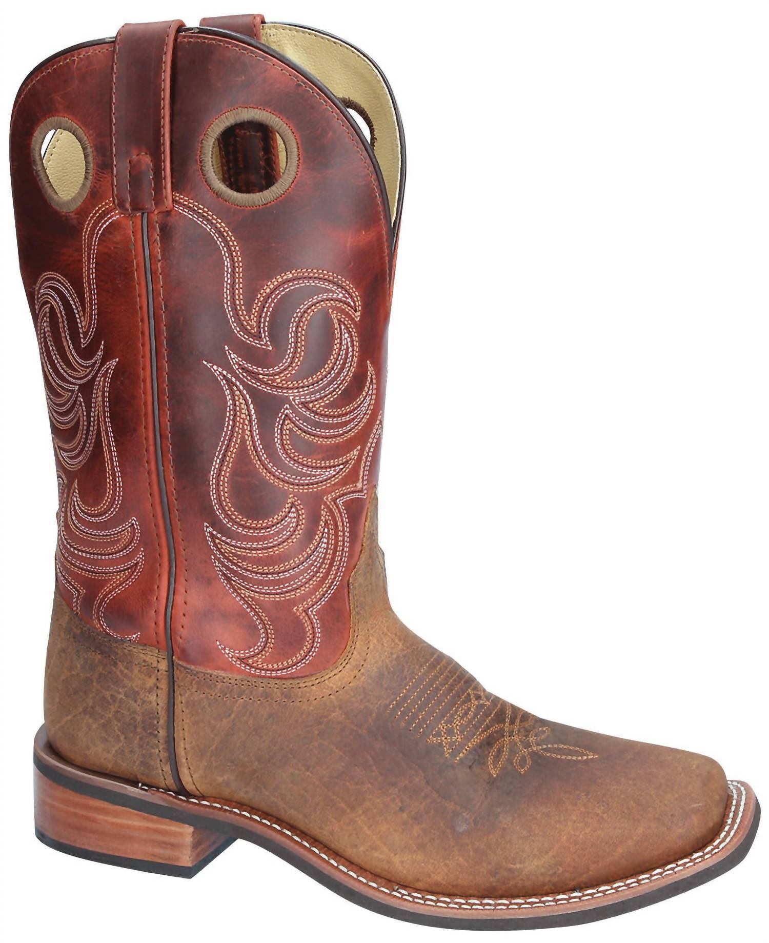 Step into style and functionality with the Smoky Mountain Boots Timber Men’s Cowboy Boot in a distinctive Brown/Burnt Apple hue. These pull-on boots feature a square toe and a comfortable block heel with a low profile (1 1/4" - 2"), perfect for outdoor work or everyday wear. Crafted from durable genuine leather, they offer a rubber sole, steel shank, PVC welt, and man-made lining for added comfort and longevity. Enjoy the intricate design on the shaft, making them a standout choice in any man's wardrobe.