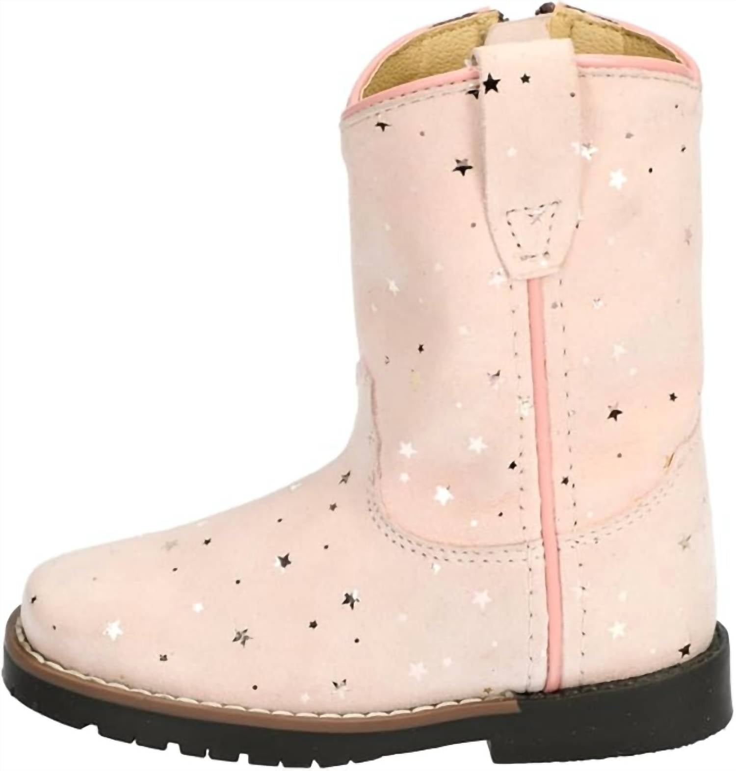 The Toddler Autry Starry Western Boots by Smoky Mountain Boots are a delightful addition to your little one's wardrobe, offering a charming pink hue with a trendy square toe design. Crafted from durable leather with a man-made lining, these boots feature a convenient side zipper closure for easy on and off. The flexible thermoplastic rubber sole and low walking heel ensure comfort and support for tiny feet, accompanied by stylish metallic stars. With a shaft height of 5.5 inches, these boots are perfect for playful adventures.
